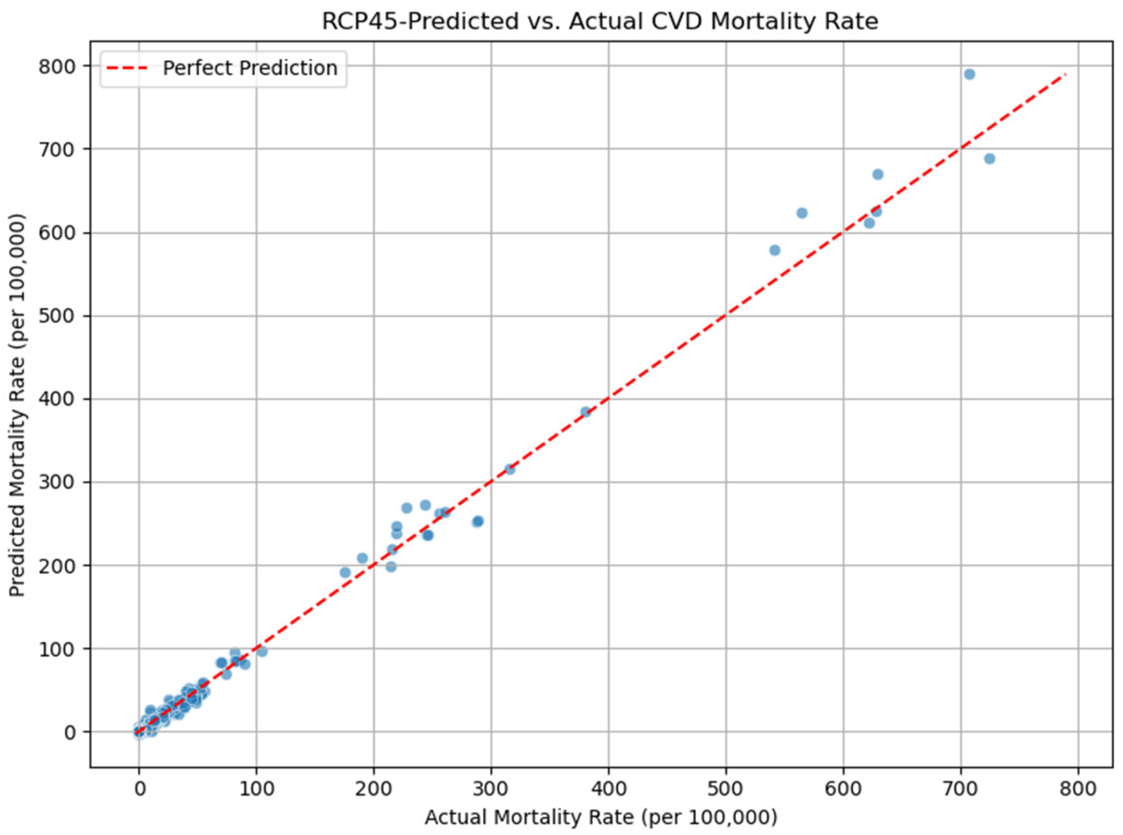 CVD | RCP4.5 | 0.7274 | 3.2359 | 0.9926 | Excellent fit; high accuracy under moderate warming. |