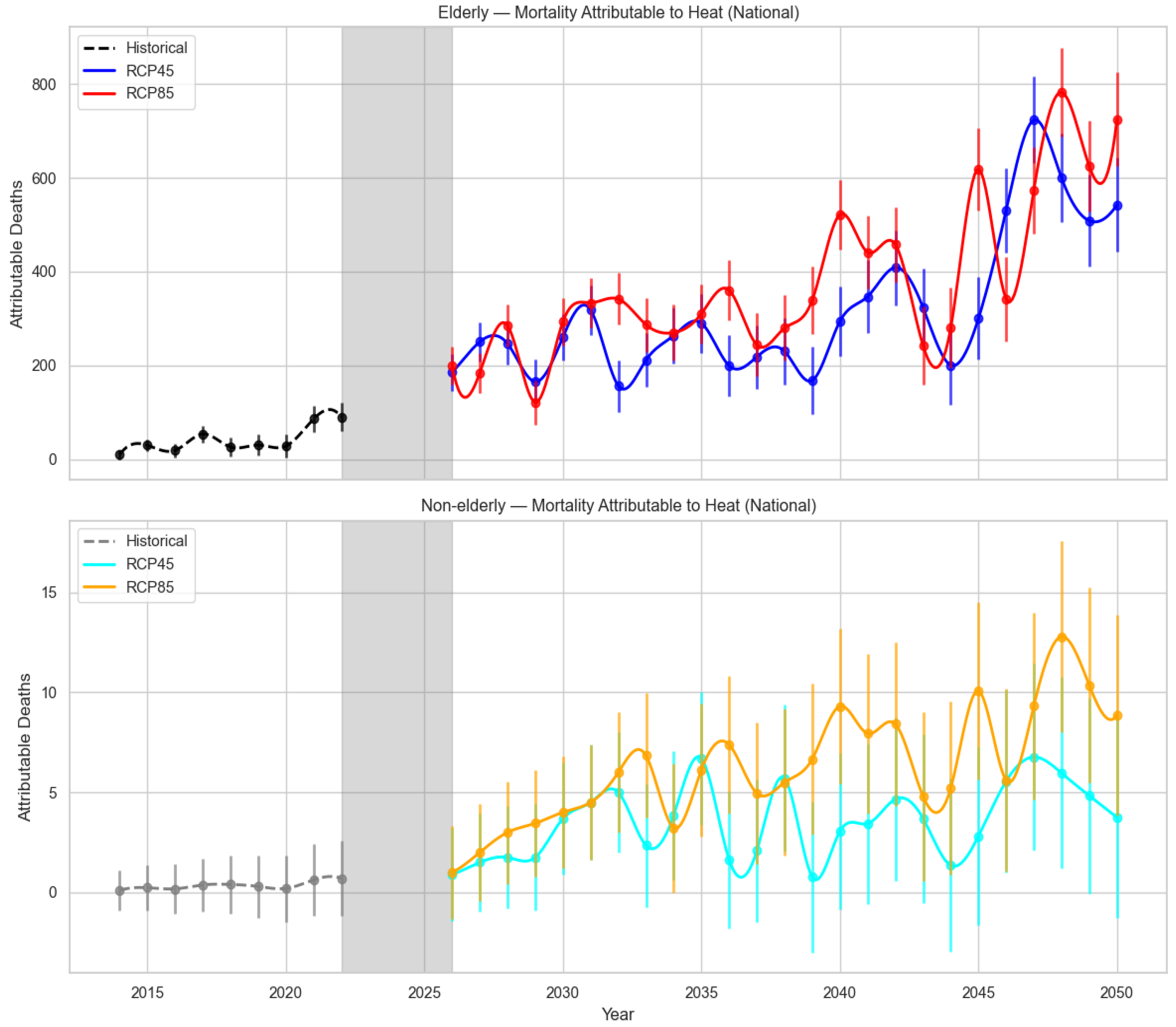 3.3.2. Projected Heatwave-Attributable Mortality (2026–2050)