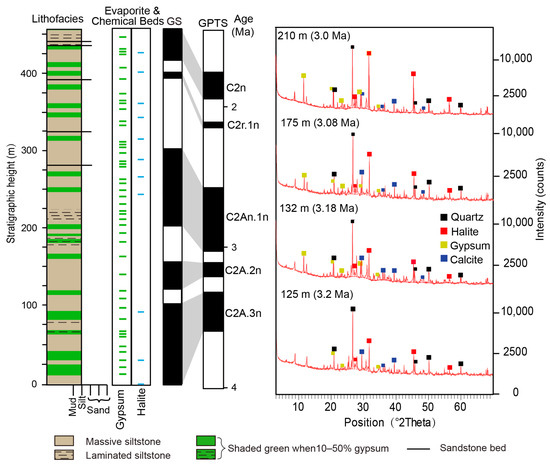 For the sulphate and chlorite minerals, the similar variation trends between the lithology of the GS section and the gypsum and halite content suggest that these two proxies can be applied when reconstructing the dry–wet variations [37,47,48,49,54].