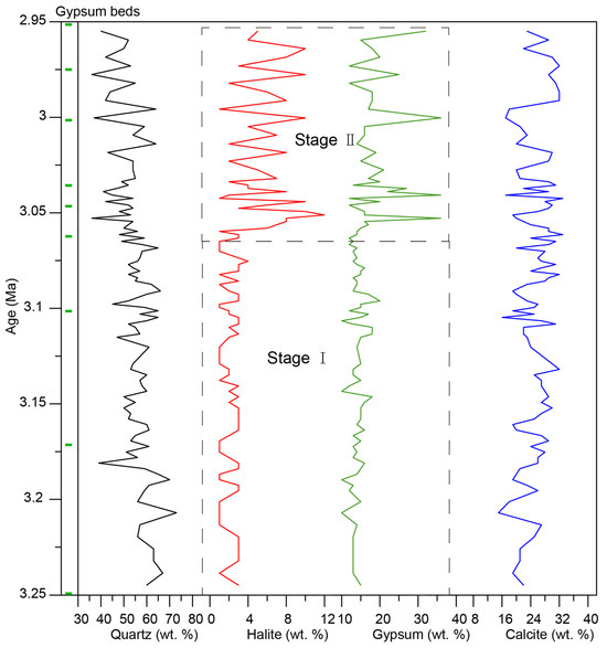Analyses of X-ray diffractograms reveal that quartz (SiO2) is the dominant detrital mineral and calcite (CaCO3), gypsum (CaSO4·2H2O), and halite (NaCl) are the main evaporite minerals (right in Figure 2). Figure 3 shows the relative content variations in these evaporite minerals, which were determined by X’Pert HighScore software. The relative content of calcite shows the rhythmic fluctuations, ranging from 15 to 33 wt.%, with an average of 25 wt.%. However, the relative content of halite and gypsum can be divided into two stages (Figure 3). At the first stage, the relative content of halite ranges from 1 to 4 wt.%, with an average 2 wt.%, and the relative content of gypsum ranges from 10 to 20 wt.%, with an average 14 wt.%. At the second stage, the relative content of halite ranges from 1 to 12 wt.%, with an average 6 wt.%, and the relative content of gypsum ranges from 12 to 36 wt.%, with an average 19 wt.%. This pattern suggests that the climatic variations indicated by calcite are different from those of gypsum and halite (Figure 3). Moreover, the variations in the relative content of gypsum are consistent with the occurrence frequency of gypsum beds in lithology, and both exhibit a similar pattern: initial low values followed by a gradual increase (Figure 3). Halite shows relatively low content variations, in accordance with the absence of halite beds in lithology (Figure 2).
