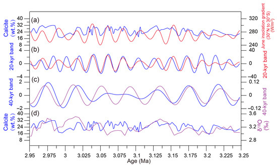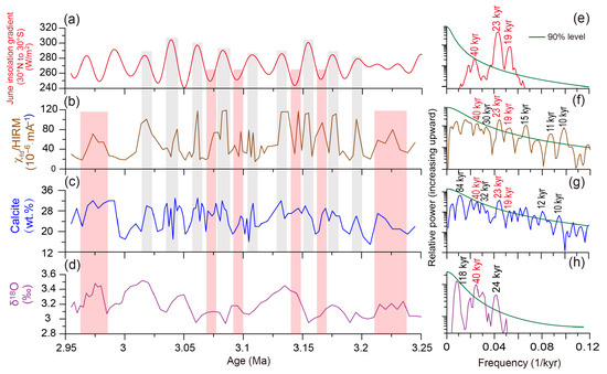 Due to the rhythmic fluctuations in its relative content, spectral analysis was performed on the calcite. The calcite records show dominant 20 kyr cycles during 3.25–2.95 Ma (Figure 4g). Moreover, a comparison of the calcite data with the June insolation gradient between 30° N and 30° S [45] reveals that high calcite values are observed in nine insolation peak values (Figure 4). This observation is supported by an in-phase relationship between the insolation and the calcite data at the 20 kyr band (Figure 5b), showing that the calcite formation was influenced by insolation at this site. However, six high values of calcite (highlighted by narrow pink bands in Figure 4) do not correspond to high values of insolation but instead correspond to high values of benthic oxygen isotope stack [46]. This observation is supported by the comparison of the 40 kyr band variations (Figure 5c), suggesting that ice sheets also influenced the calcite formation. These periodic variations indicated by the calcite records are consistent with the χfd/HIRM records from the GS section (Figure 4) [34], suggesting that these two proxies may have recorded consistent paleoclimate variations in this site during this warm interval. However, in terms of variation trends, the calcite and χfd/HIRM records are inconsistent (Figure 4).
