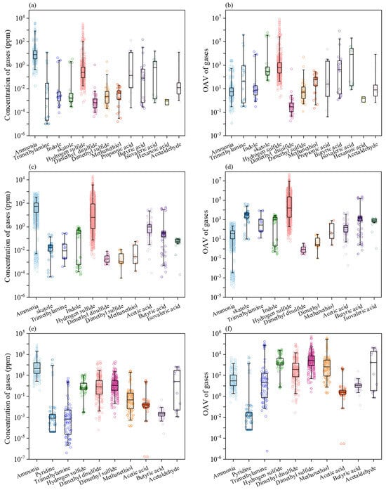 The distribution of odor concentration and odor activity value (OAV) in the barn (a,b), storage (c,d), and treatment (e,f) links. The box line represents the interquartile range (25–75%), the upper and lower whiskers represent the data range from 5% to 95%, and the dots represent the raw data points.