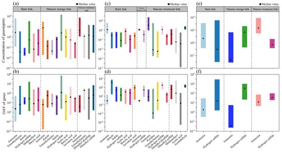 As shown in Figure 2c,d, in chicken houses, NH3 is reported with a high concentration (maximum value of 311), but the main odor-causing gas was skatol. As shown in Figure 2e,f, in cattle houses, two gases are reported, namely NH3 and H2S. After manure is removed from the livestock houses, part of it is stored, and part of it is treated [64]. Due to differences in feeding management, feed composition, and digestive systems, the characteristics of manure vary, resulting in different gas emissions. It was reported that TN and TP in chicken manure were higher than those in pig manure and cow manure, while chemical oxygen demand (COD) in pig manure was higher than that in cow manure and chicken manure. In the case of pig manure [62], there are reported higher concentrations of gases during the storage link. The main gases reported are NH3, H2S, and butyric (maximum value of 860, 20,057, and 44 ppm), with higher concentrations. The main odor-causing gases are H2S and butyric acid. In cattle houses, two gases, NH3 and H2S, are reported, with H2S having a much greater odor potential than NH3.