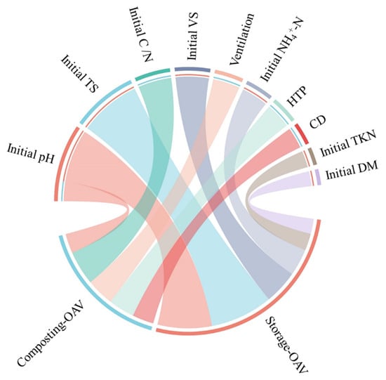 The relative importance of manure storage parameters and composting parameters in relation to OAV changes. The widths of the link lines indicate the importance of each driver for different links. TS, VS, TKN, DM, CD, and HTP represent total solids, volatile solid, total Kjeldahl nitrogen, dry matter, composting duration, and high-temperature period, respectively.