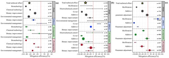 The effects of different mitigation technologies on total gas emissions and N, S, and C-compound gas emissions in barn (a), manure storage (b), and manure treatment links (c). Mean effect values and 95% confidence intervals are shown. The total number of observations for each treatment is displayed on the right-hand side of the results, and the point size is related to the number of observations. Red vertical lines indicate the mitigation efficiency = 0. The asterisks have the same meaning as the points in the diagram.