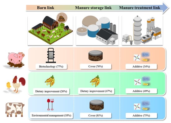 According to Figure 5, from the perspective of the whole chain, starting from pig houses to pig manure treatment, an analysis was conducted on the emission reduction potential of various technologies currently applied. The results indicate that in the barn link, biological methods—such as biofilters and bio-trickling filters—demonstrate high efficacy (77%) in reducing odor emissions. This can be attributed to the enhanced microbial degradation of VOCs and ammonia by immobilized microorganisms under aerobic conditions. Dietary improvement showed good potential (40%) for odor reduction in pig barns, possibly due to the complex dietary habits of pigs (Figure S2). Adjusting the concentration of certain substances in the feed may lead to an increase in the emissions of other gases. In the manure storage link, covering systems exhibited a high emission reduction performance (76%). These covers function primarily by limiting gas exchange, inhibiting the release of NH3 or other gases. In the manure treatment link, the use of additives (34%) shows promising potential for odor emission reduction.