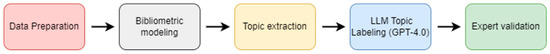 This study adopts a framework combining bibliometric analysis with LLM—assisted semantic enhancement to improve automation, semantic accuracy, and interpretive coherence in topic identification [26].The process includes the following four stages: