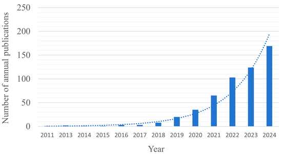 Bibliometric analysis, as an important method to reveal the evolution of research hotspots and the development of the field, can effectively reflect the quantitative changes and trend characteristics of academic output [31]. Statistics on the field of AI-NBS show that relevant research has been growing continuously between 2011 and 2024. In particular, it has entered a rapid development phase since 2020, with a significant increase in the number of annual publications, indicating that the topic has been gaining attention in the academic community (Figure 2).