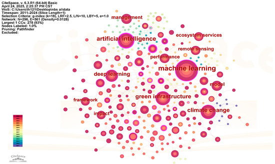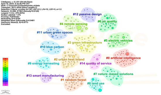 In order to reveal the knowledge structure evolution and research focus in the intersection of AI and NBS, this paper constructs a keyword co-occurrence network based on CiteSpace and performs a clustering analysis. Figure 4 illustrates the top 15 key clustering structures in this network. Each node in the graph represents a keyword, and the size is proportional to the co-occurrence frequency; the thickness of the edges reflects the strength of semantic association between keywords. The clusters are distinguished by different colors and identified by numerical numbers, characterizing the potential research themes to which each corresponds.