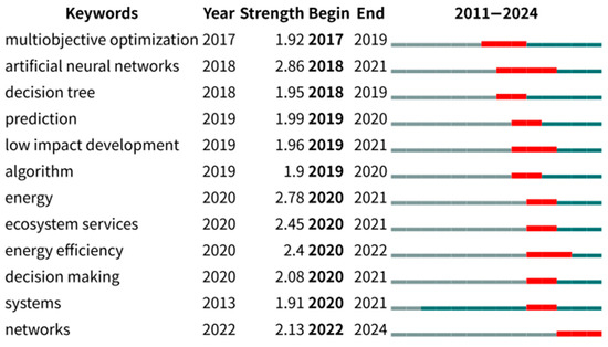 To more clearly characterize the knowledge evolution of AI-NBS research, this study further introduces the keyword burst detection map (Figure 6) to identify the citation impact of keywords over different time periods. The results indicate that terms such as artificial neural networks (2018–2021), ecosystem services (2020–2021), and networks (2022–2024) exhibited significant citation bursts during specific stages, reflecting their temporal research intensity. These burst patterns, from the perspective of citation influence, corroborate the thematic evolution trajectories shown in Figure 5, providing complementary evidence in terms of keyword activity and research attention.