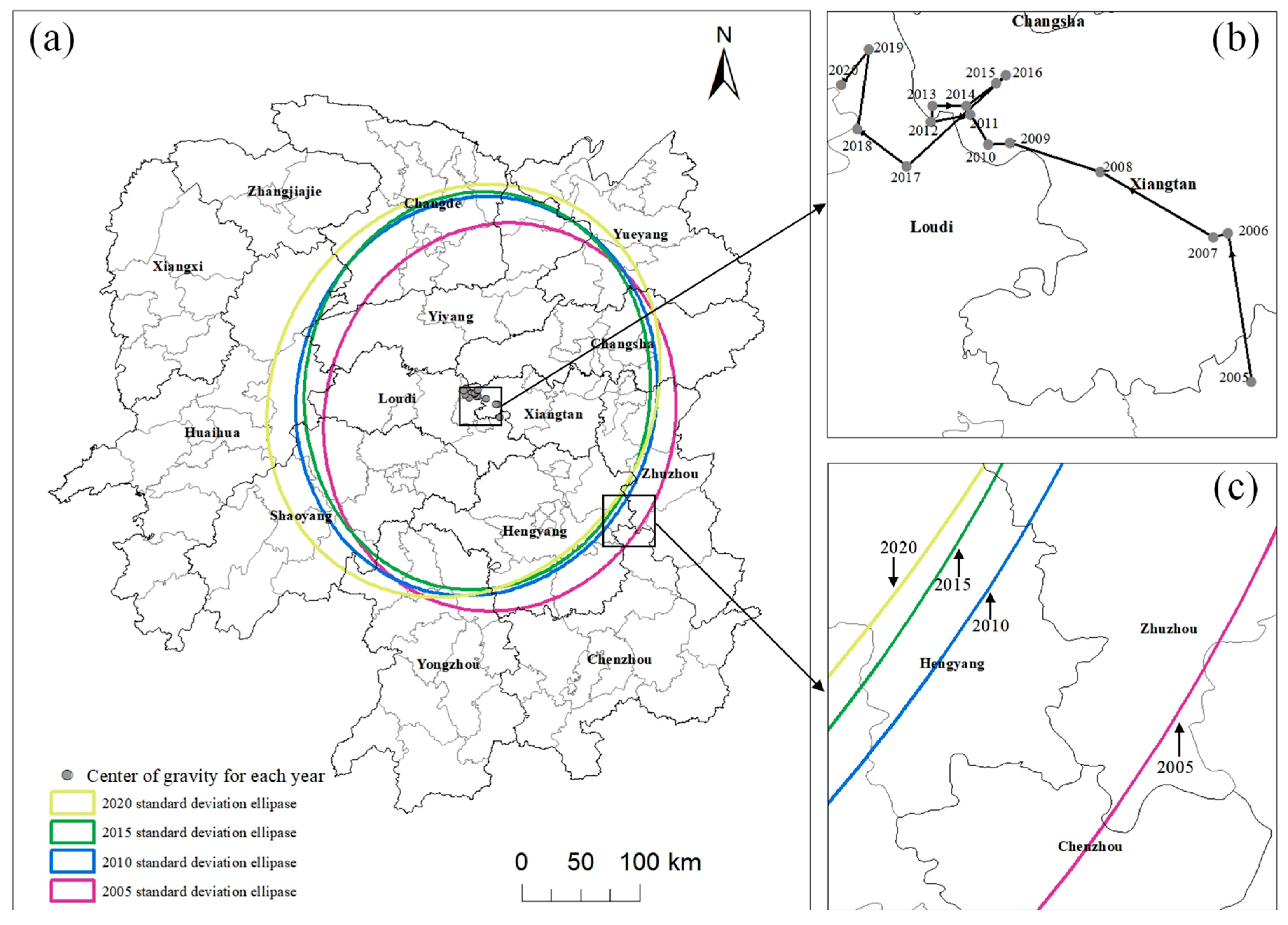 - During the period 2005–2020, the center of gravity for net carbon sinks in county-level farmland ecosystems of Hunan Province was predominantly located within Xiangxiang City, following a dynamic trajectory of “northwest–southwest–northwest–northeast–southwest–northwest.” This path reflects a general northwestward migration of the center of gravity, indicating that western and northern counties exhibited higher growth rates in net carbon sequestration compared to other regions. Analysis of the Standard Deviational Ellipse (SDE) further reveals a “northeast–southwest” spatial distribution pattern of net carbon sinks in county-level farmland ecosystems of Hunan Province, which demonstrates a contracting trend with increasing spatial agglomeration over the study period.