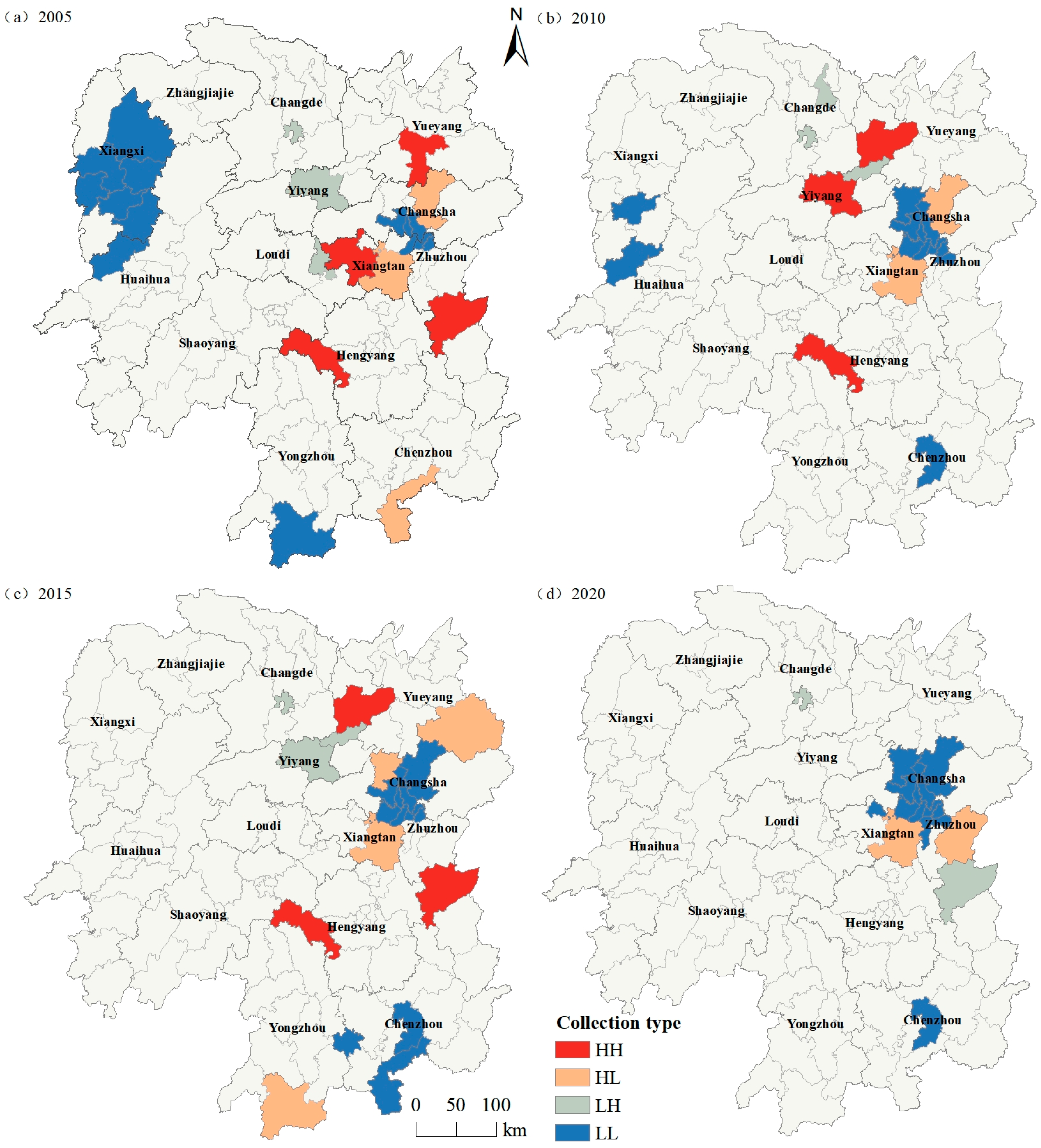 - From 2005 to 2020, the net carbon sinks of county-level farmland ecosystems in Hunan Province showed a significant spatial positive correlation, and the degree of aggregation gradually increased amid fluctuations. From a local perspective, the clusters of net carbon sinks of county-level farmland ecosystems in Hunan Province show a significant spatial agglomeration characteristic of “high in the east and low in the west”. The HH clusters were mainly distributed in some counties in eastern Hunan represented by Xiangtan County, and the LL clusters were mainly distributed in some counties in eastern Hunan represented by Yuelu District and Yuhua District. Over time, the LL clusters moved from western Hunan to eastern Hunan. The spatial scale and number of counties in different clusters types fluctuated slightly over time.