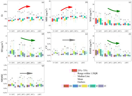Performance parameters of the automated instruments in different temperatures. (a) Er; (b) MBE; (c) MAE; (d) SD; (e) CV; (f) RMSE; and (g) NRMSE. Note: Multiple comparisons were calculated using the SPSS v21.0 software. The upper-case letter indicates that the mean difference is significant at the 0.01 level (p < 0.01); and the lower-case letter indicates that at the 0.05 level (p < 0.05). Arrows indicate the overall variation trends of the parameters.