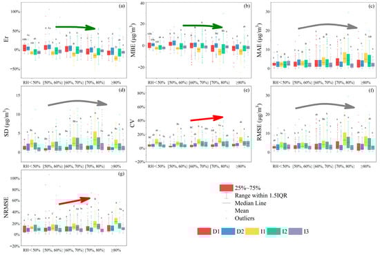 Performance parameters of the automated monitoring instruments at different humidities. (a) Er; (b) MBE;(c) MAE; (d) SD; (e) CV; (f) RMSE; and (g) NRMSE. Note: Multiple comparisons were calculated using the SPSS v21.0 software. The upper-case letter indicates that the mean difference is significant at the 0.01 level (p < 0.01); and the lower-case letter indicates that at the 0.05 level (p < 0.05). Arrows indicate the overall variation trends of the parameters.