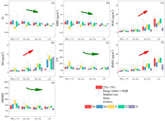 Performance parameters of automated monitoring instruments at different PM2.5 concentrations. (a) Er; (b) MBE;(c) MAE; (d) SD; (e) CV; (f) RMSE; (g) NRMSE. Arrows indicate the overall variation trends of the parameters.
