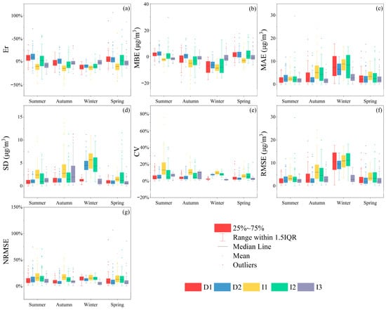 Performance parameters of the automated monitoring instruments in different seasons. (a) Er; (b) MBE; (c) MAE; (d) SD; (e) CV; (f) RMSE; (g) NRMSE.