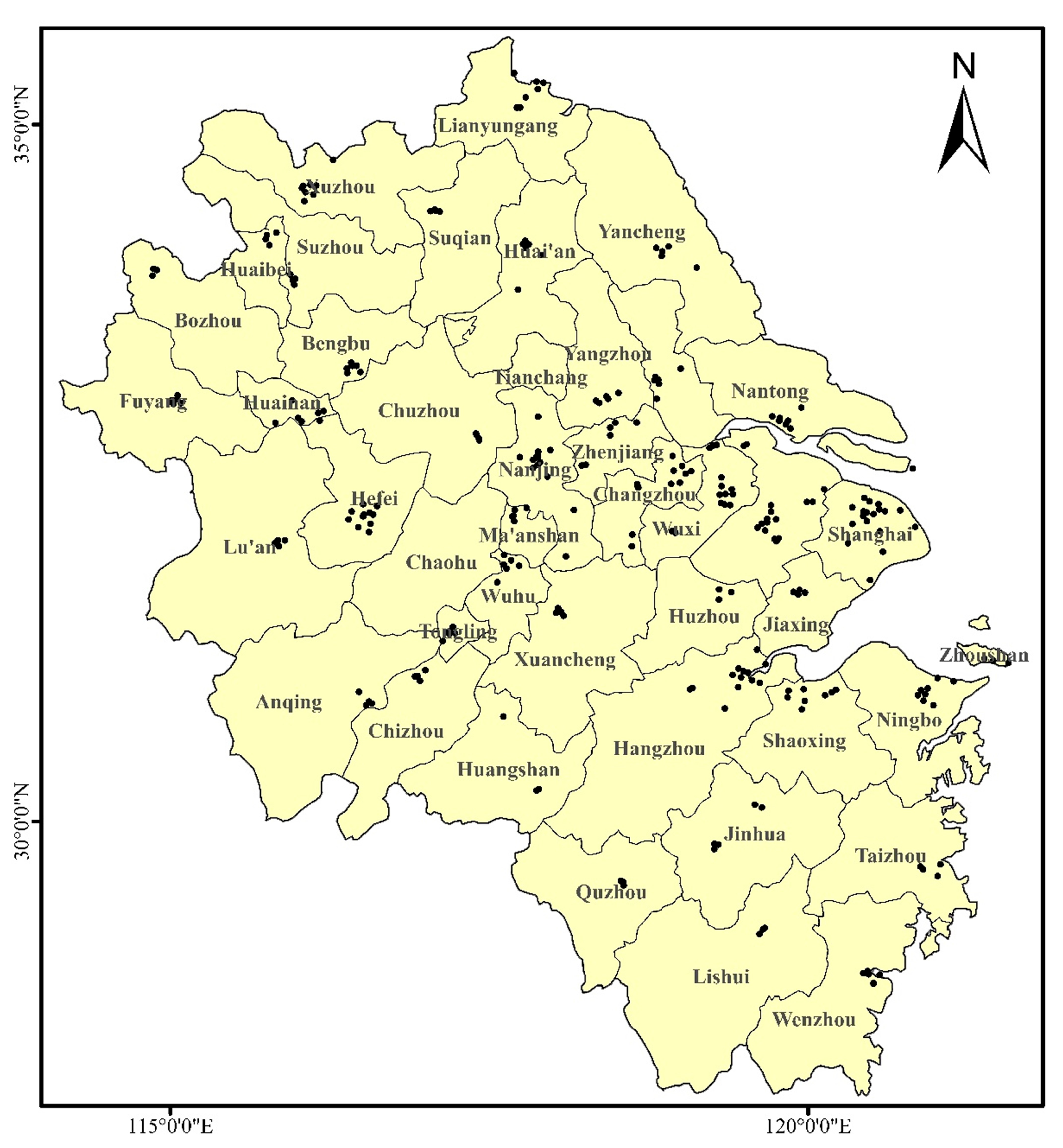 Figure 1. Geographic placement of air quality monitoring stations in cities across the Yangtze River Delta.