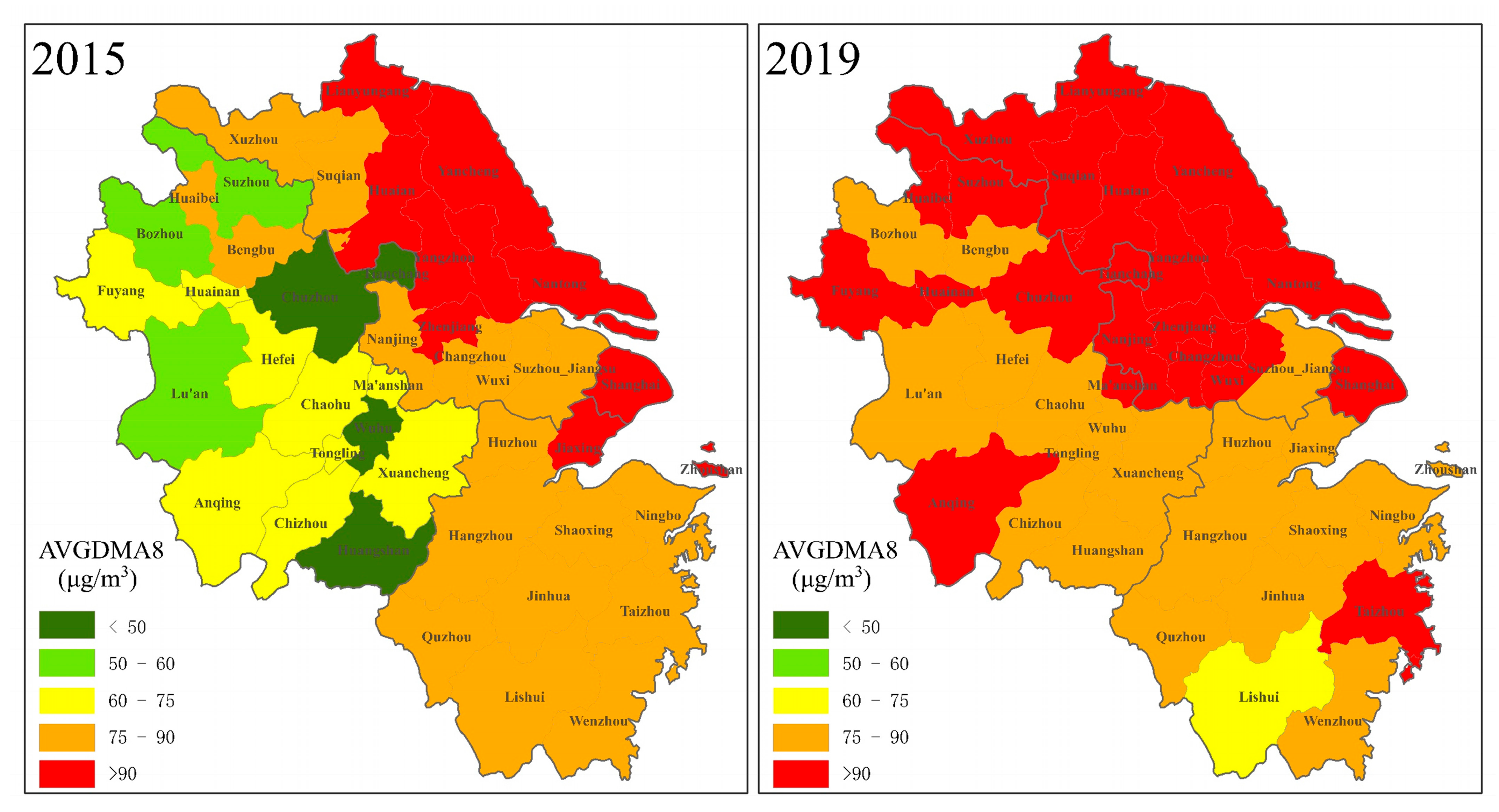 Figure 2. Spatiotemporal distribution of AVGDMA8 O3 concentrations across the YRD in 2015 and 2019.