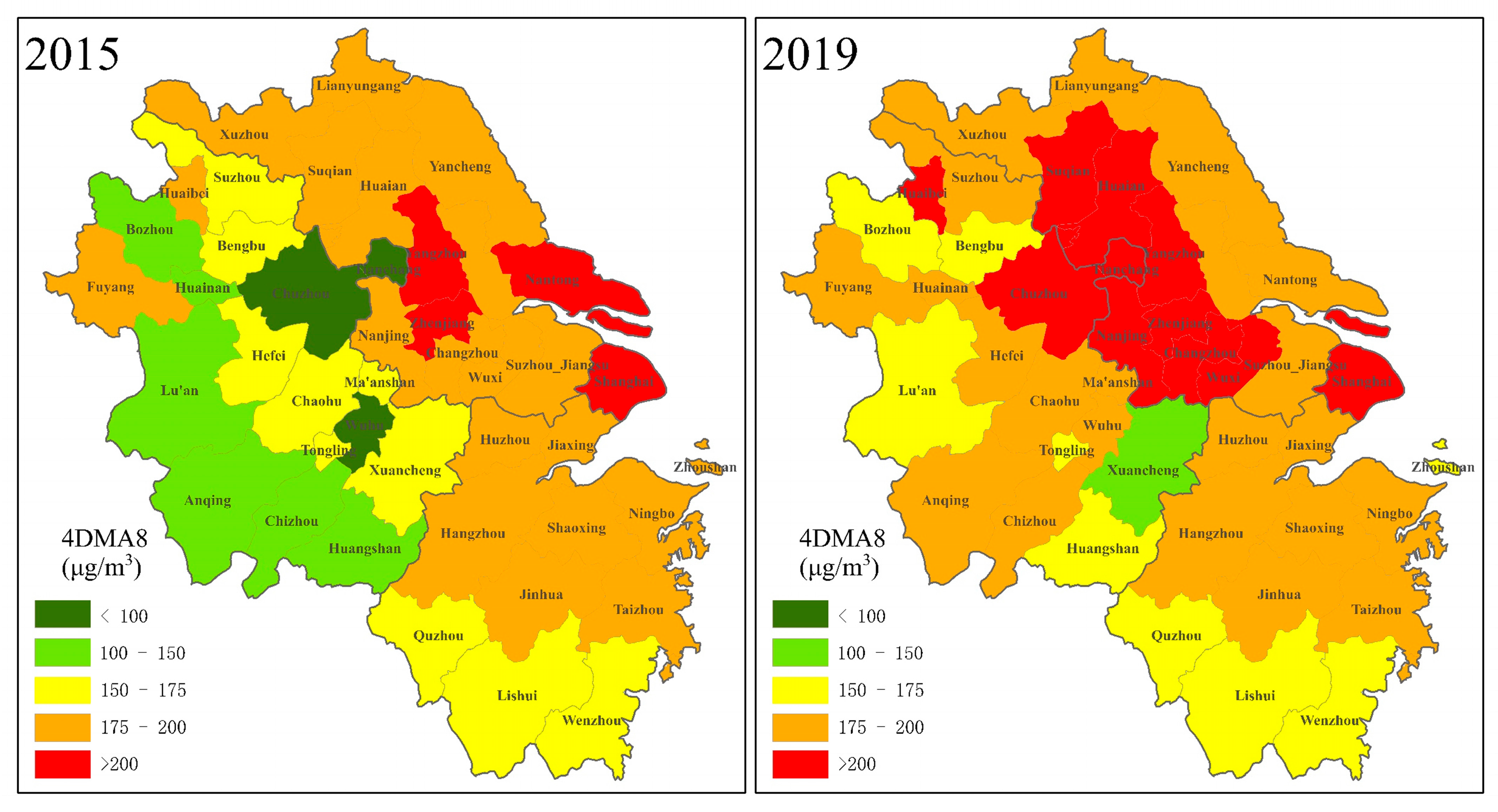 Figure 3. Spatiotemporal distribution of 4DMA8 O3 concentrations across the YRD in 2015 and 2019.