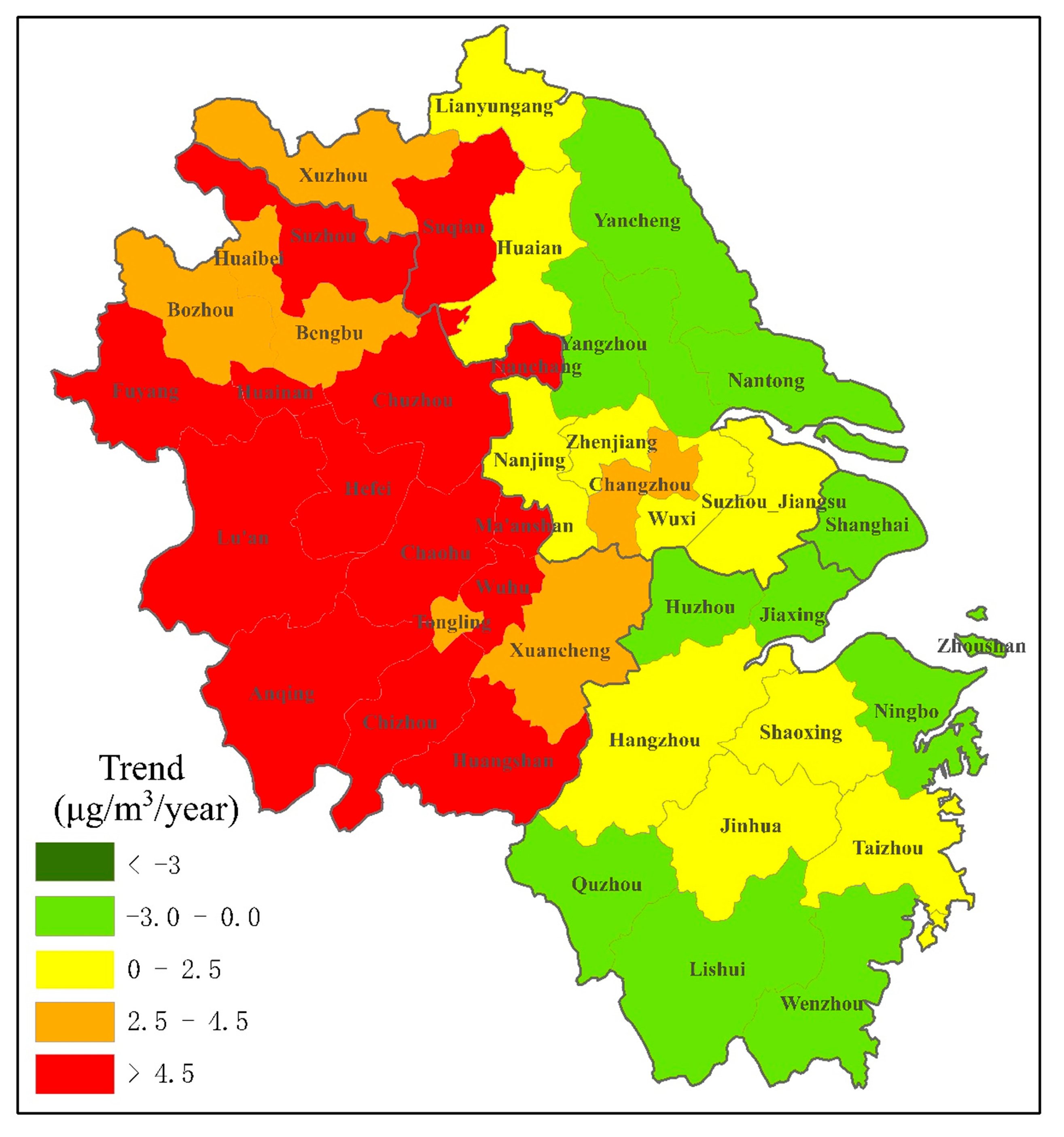 Figure 4 illustrates the absolute trends and regional variations in DMA8 O3 concentrations. The data show that DMA8 O3 levels in the YRD region generally rose from 2015 to 2019, with a mean annual rise of 2.9 ± 3.5 μg/m3.