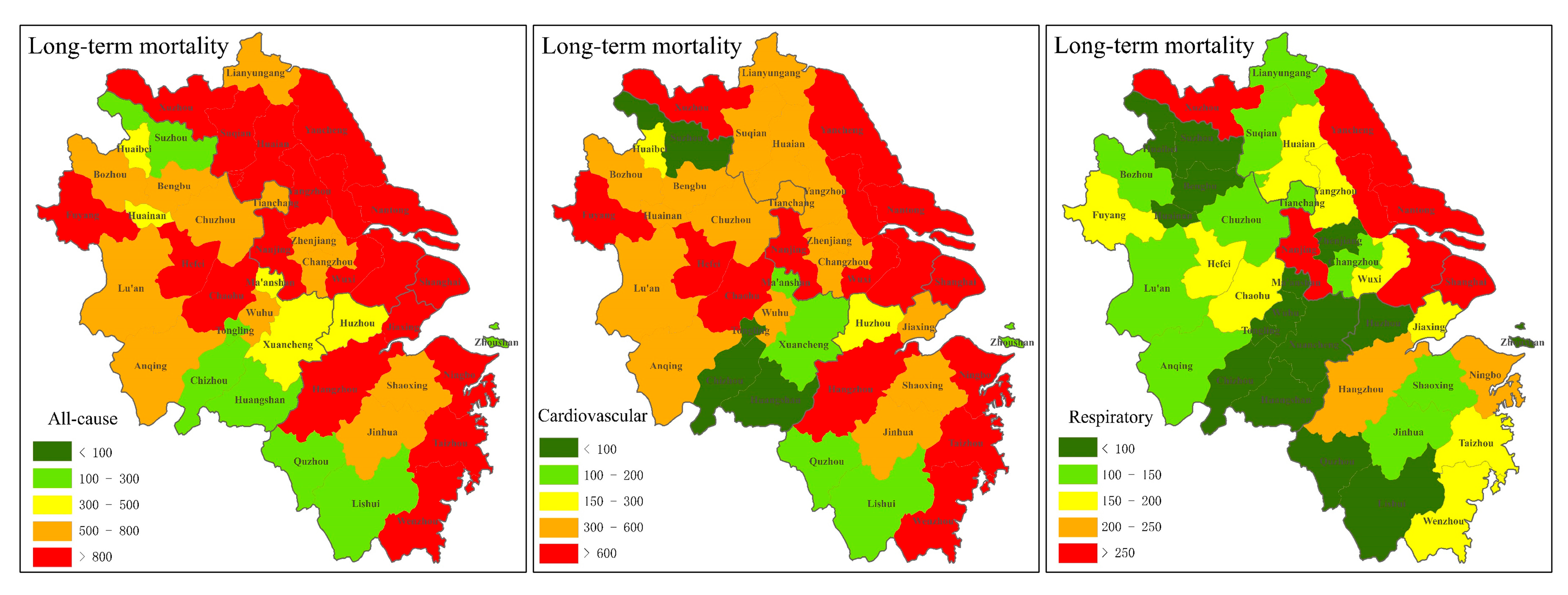 Previous epidemiological studies have consistently demonstrated a strong link between prolonged O3 exposure and various health complications, particularly respiratory illnesses, chronic obstructive pulmonary disease (COPD), and cardiovascular disorders [33,40]. Drawing on the relative risk assessments published by Turner et al. [33]. This study aimed to put a number on the premature deaths caused by prolonged ozone exposure between 2015 and 2019, looking at deaths from all causes as well as those specifically due to respiratory and cardiovascular issues. Figure 5 graphically depicts the geographical spread of the five-year average mortality rate attributable to O3 exposure for each disease category across cities in the YRD region.