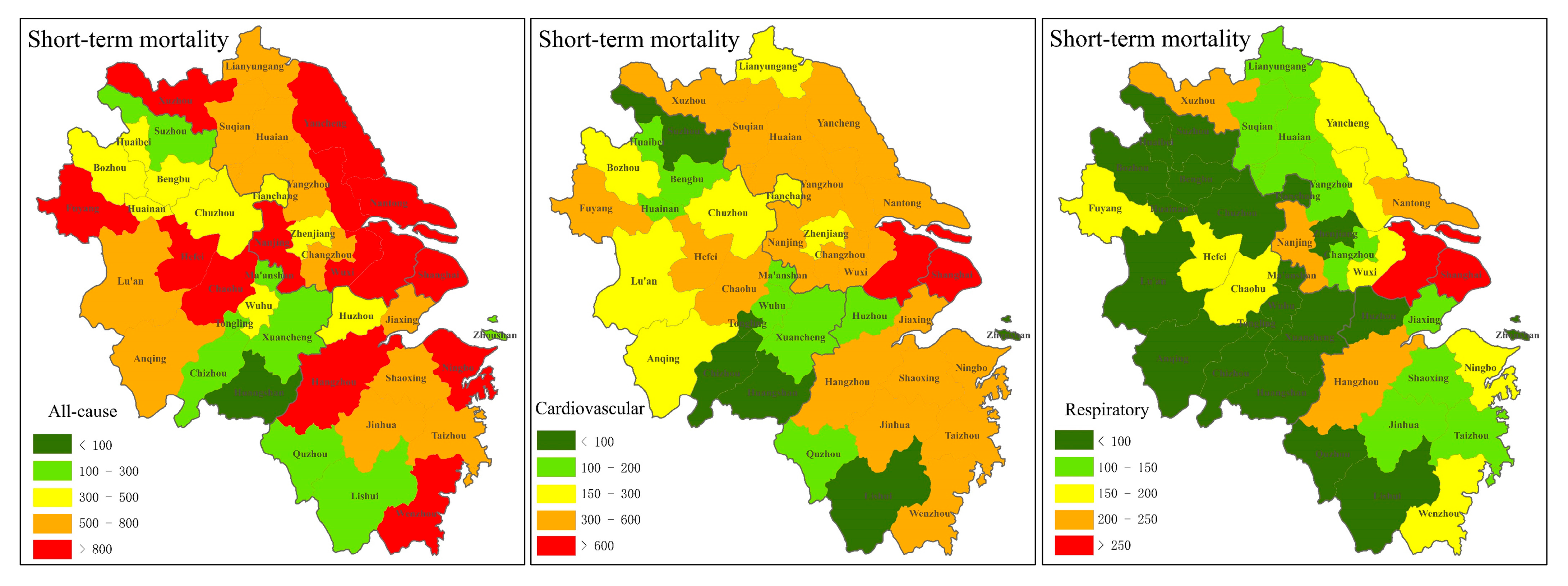 The highest burdens of cardiovascular mortality associated with short-term O3 exposure were observed in four cities: Shanghai (1777 deaths; 95% CI: 670–2850), Suzhou in Jiangsu Province (675 deaths; 95% CI: 250–1080), Hangzhou in Zhejiang Province (574 deaths; 95% CI: 220–920), and Nanjing in Jiangsu Province (558 deaths; 95% CI: 210–890). The cities with the highest respiratory mortality followed similar rankings: Shanghai (684 deaths; 95% CI: 360–1040), Suzhou (260 deaths; 95% CI: 140–390), Hangzhou (221 deaths; 95% CI: 120–330), and Nanjing (215 deaths; 95% CI: 110–320). Across most cities, cardiovascular mortality accounted for approximately 71–72% of total short-term O3-related deaths.