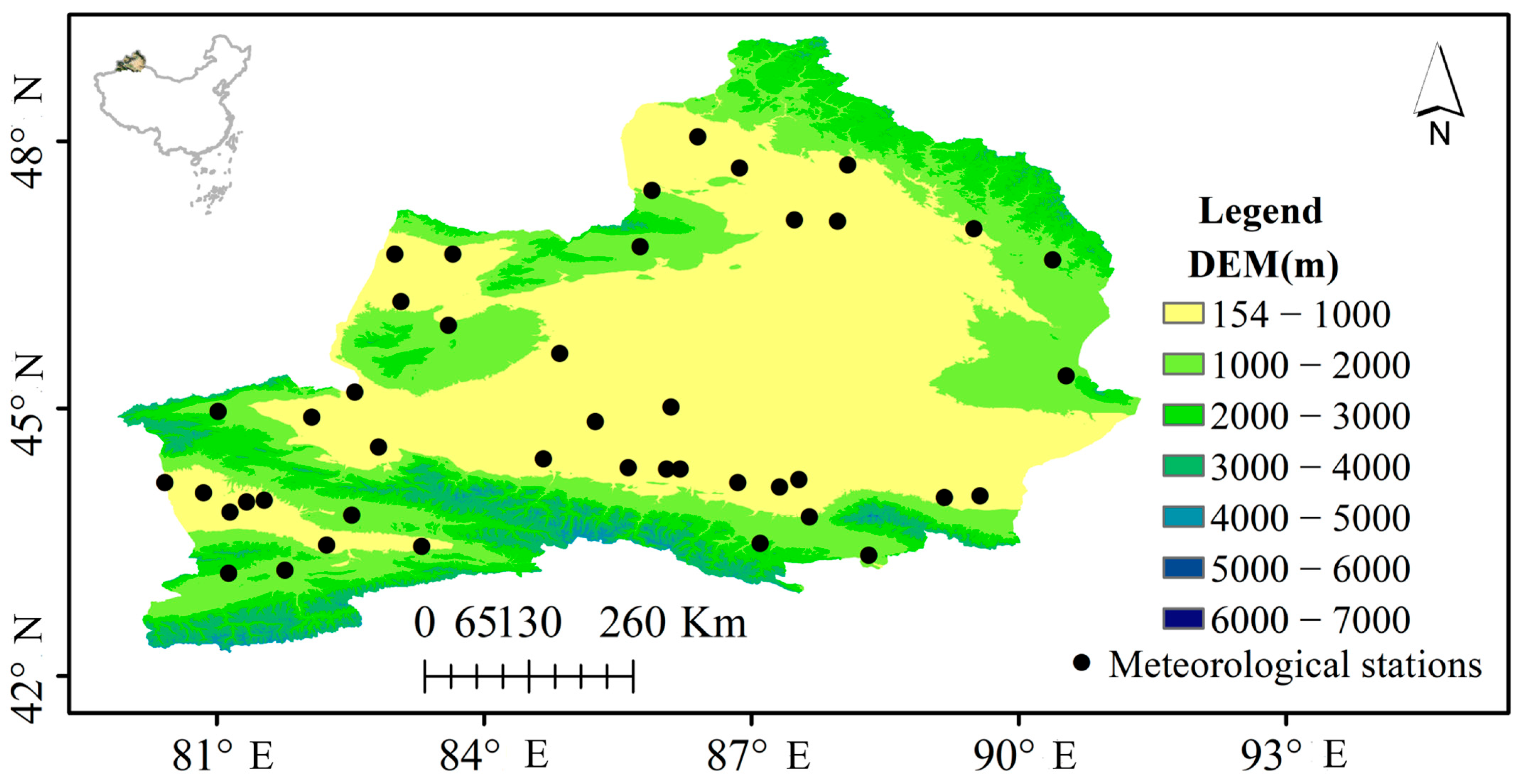 - Zhao, L.; Yang, Q.; Han, X.Y.; Liu, Y.L. Spatial and temporal differences in extreme precipitation events in Xinjiang from 1961 to 2009. Desert China 2014, 34, 550–557. [Google Scholar]