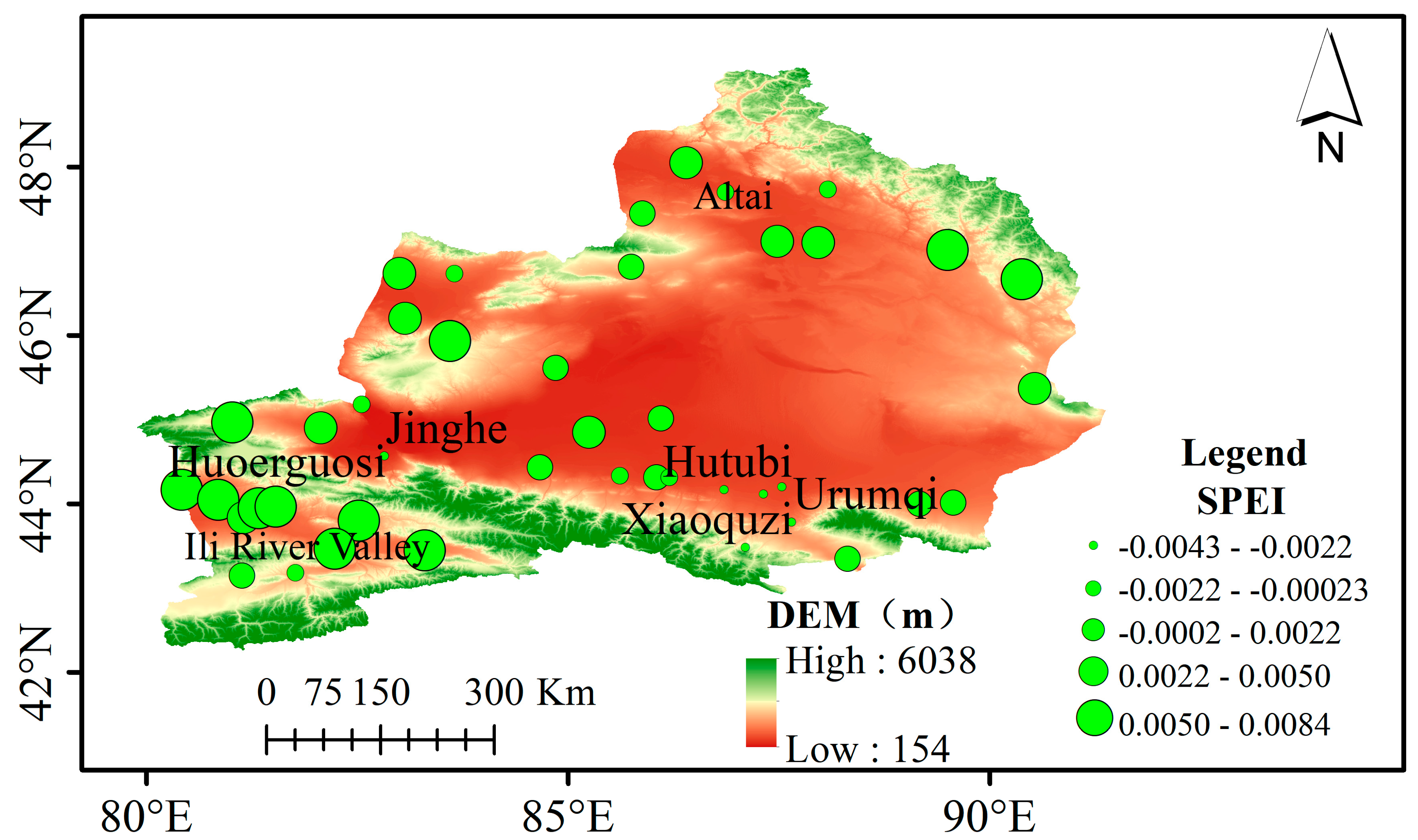 - Wu, Y.F. The Spatiotemporal Evolution Characteristics of Meteorological Drought in Northern Xinjiang over the Past 52 Years. Ph.D. Thesis, Xinjiang Agricultural University, Urumqi, China, 2016. [Google Scholar]