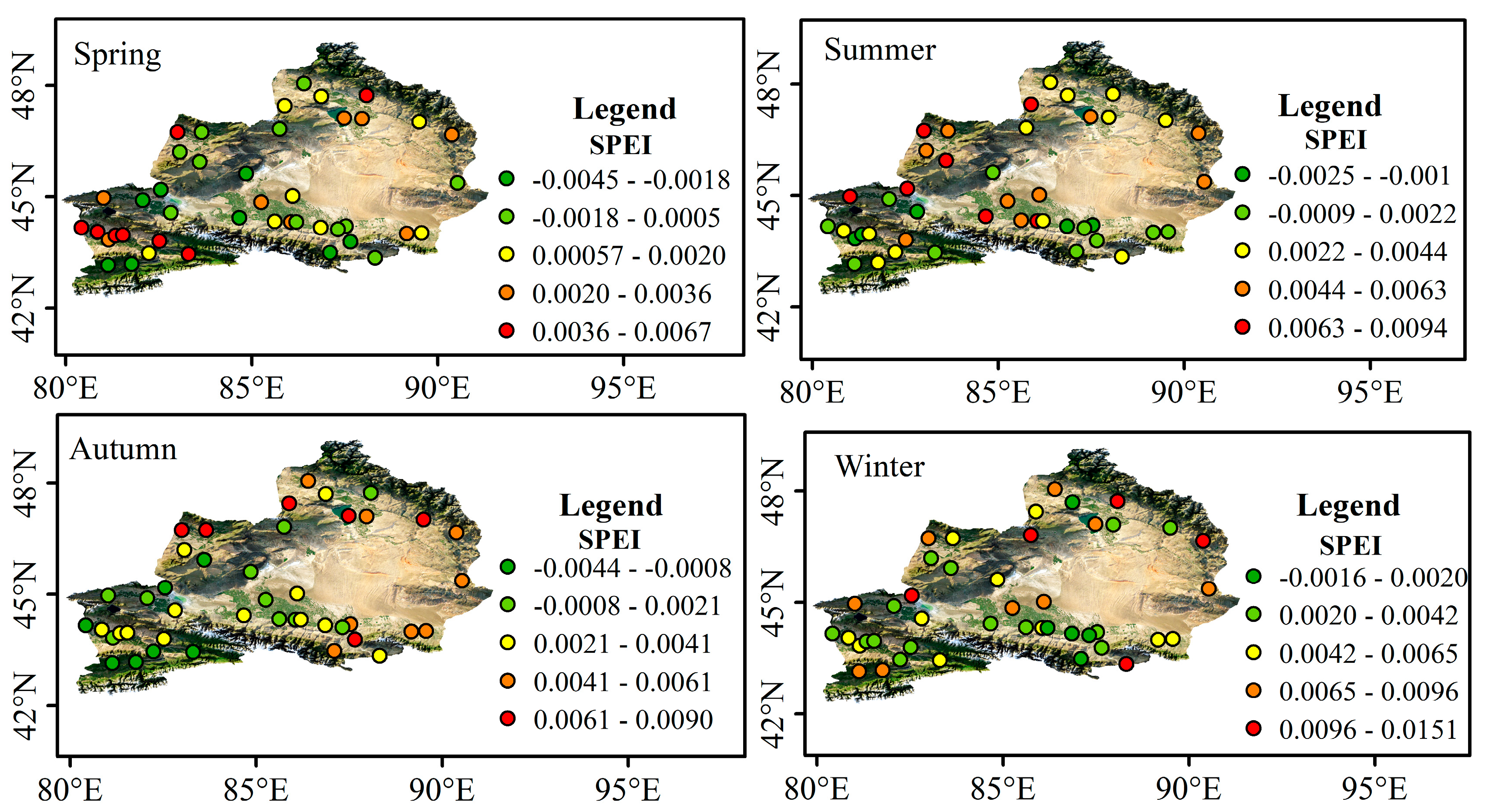 - Li, Y.; Sun, C.F. Impacts of the superimposed climate trends on droughts over 1960–2013 in Xinjiang, China. Theor. Appl. Climatol. 2017, 129, 977–994. [Google Scholar] [CrossRef]