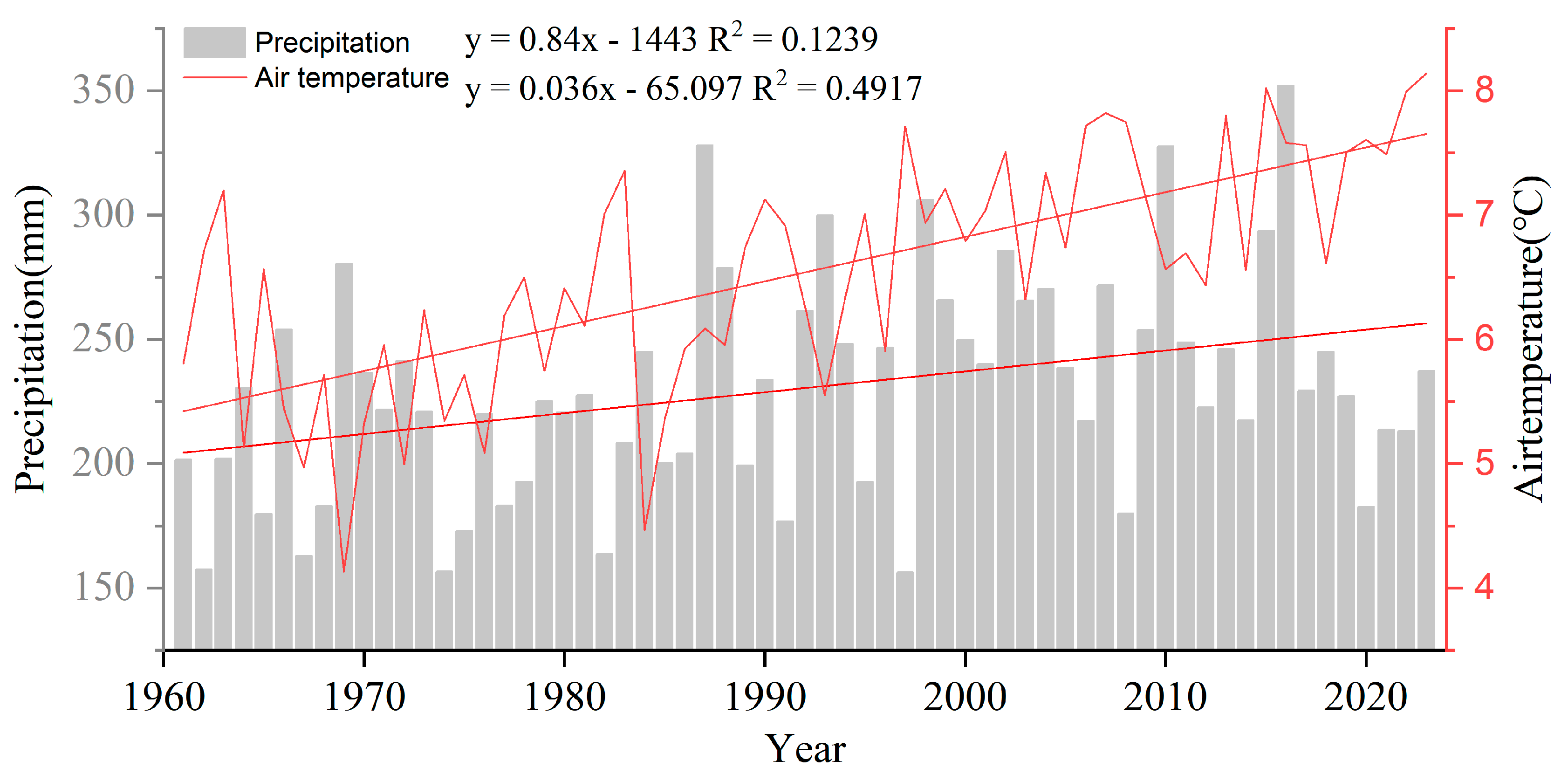 - Xu, C.C.; Li, J.S.; Zhao, J.; Gao, S.T.; Chen, Y.P. Climate variations in northern Xinjiang of China over the past 50 years under global warming. Quatern. Int. 2015, 358, 83–92. [Google Scholar] [CrossRef]