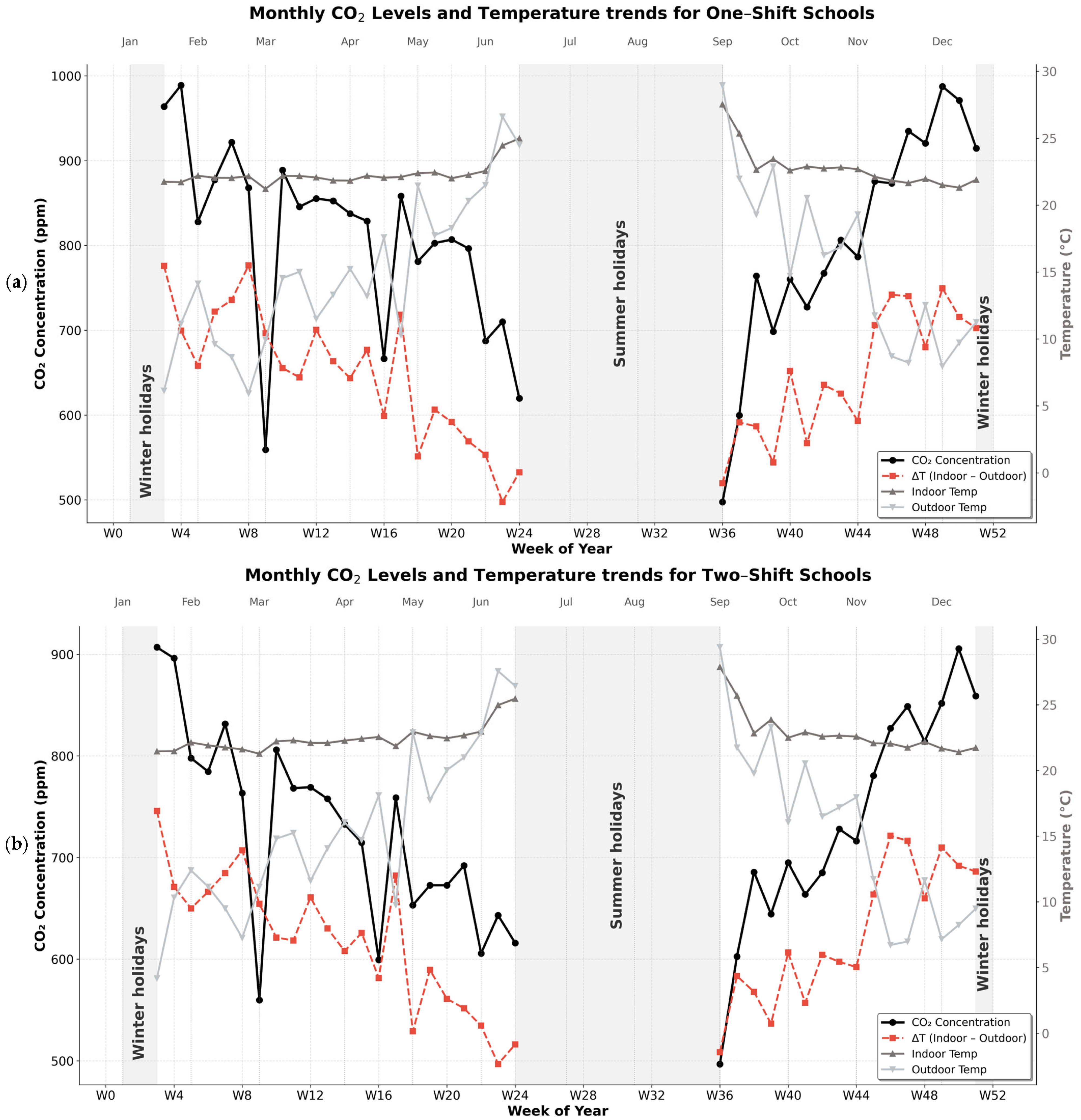- Honan, D.; Gallagher, J.; Garvey, J.; Littlewood, J. Indoor Air Quality in Naturally Ventilated Primary Schools: A Systematic Review of the Assessment & Impacts of CO2 Levels. Buildings 2024, 14, 4003. [Google Scholar] [CrossRef]