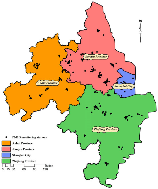 The hourly updated ground PM2.5 concentration data used in this study were derived from the hourly concentration values and 24 h concentration averages released in real time by the China Environmental Monitoring Center (CEMC) through the “National Urban Air Quality Real-time Release Platform” (https://www.sysu.edu.cn/newsen/info/1701/55691.htm, accessed on 26 October 2025). The ground PM2.5 concentration data are obtained by monitoring using the micro-oscillating balance method, also known as the β-ray method. For our study, the hourly PM2.5 concentration data for each monitoring station for the 365 days from 1 January to 31 December 2023 were downloaded. The research area covers 16 prefecture-level cities, 117 county-level cities, and 184 ground-based monitoring stations in the Yangtze River Delta region. The distribution of the research area and stations is shown in Figure 2.