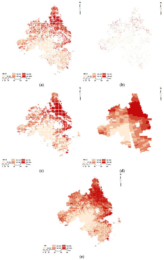 The MODIS AOD data used in this study were the C6 version of aerosol products downloaded from the LAADS (Level-1 Atmosphere Archive and Distribution System) website (https://ladsweb.modaps.eosdis.nasa.gov/, accessed on 26 October 2025), including AOD with a resolution of 3 km (M*D04-3K) and AOD with a resolution of 10 km (M*D04-L2), where “*” denotes “O” and “Y” (which stand for Terra and Aqua, respectively). The downloaded data were all in the HDF layered data format, and the remote sensing image processing software ENVI5.6 was used for unified projection and format conversion to obtain geotiff format files with a projection coordinate system of WGS-1984.