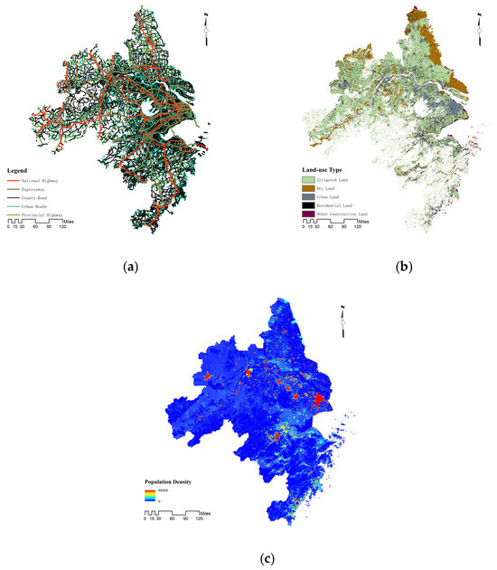 Preprocessing results for other independent variables: (a) Road network distribution in the Yangtze River Delta region in 2020; (b) land use distribution in the AOD filling and fusion results in the Yangtze River Delta region in 2023; (c) population density of the Yangtze River Delta region in 2020.
