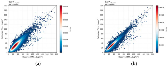 Density scatter plot of estimated and measured values for the XGBoost and LSTM models: (a) XGBoost; (b) LSTM.