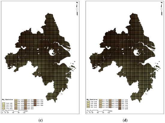 Retrieval results of PM2.5 concentration in the Yangtze River Delta urban agglomeration at quarterly time points: (a) Retrieval results as of 1 March 2023; (b) Retrieval results as of 1 June 2023; (c) Retrieval results as of 1 September 2023; (d) Retrieval results as of 1 December 2023.