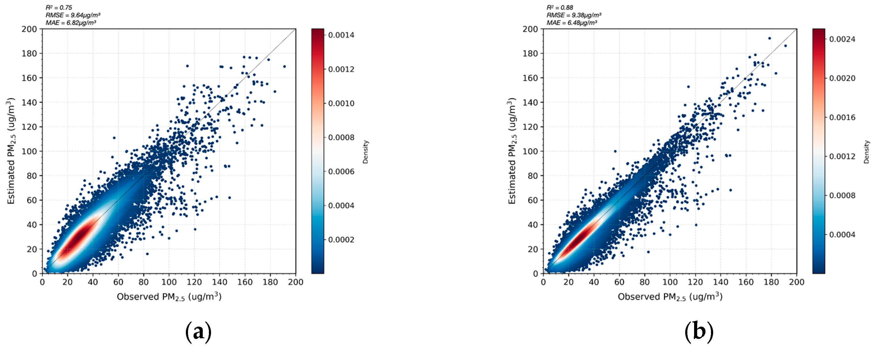 This study compared and analyzed the results of a PM2.5 concentration simulation using the two models at each station through a density scatter plot.