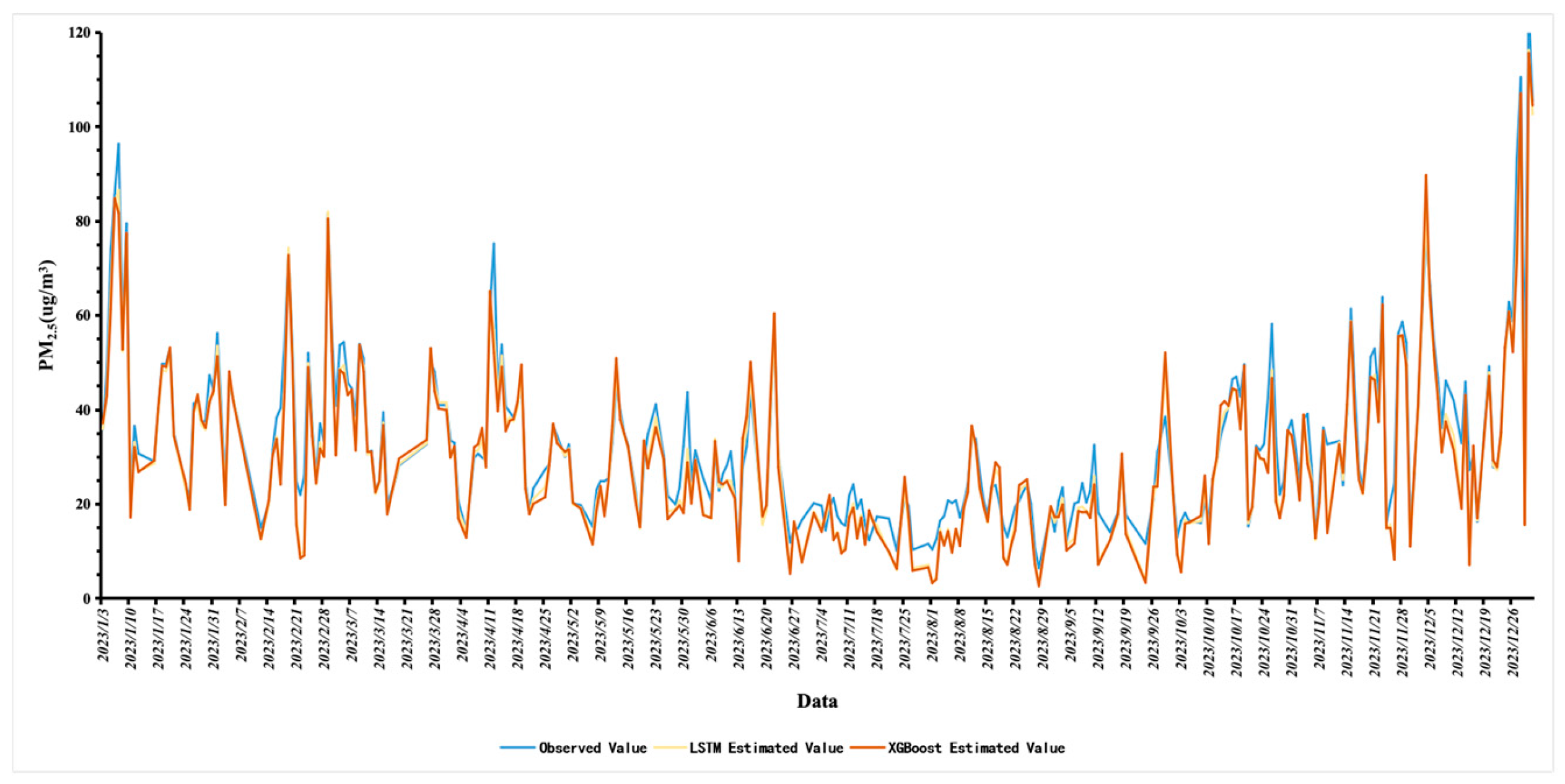The area covered by this study was carefully divided into 27,333 3 × 3 km2 longitude and latitude grid cells. The LSTM model and the XGBoost model simulated the near-surface PM2.5 concentration for 365 days in 2023 and produced a total of 2,702,773 sets of data. By averaging the daily simulated data, this study successfully derived the daily average simulated value (estimated value) of the near-surface PM2.5 concentration in the Yangtze River Delta urban agglomeration in 2023, and the data series are presented in the form of a line graph. At the same time, in order to achieve an intuitive comparison with the measured data, this study also shows the daily average station-observed values (observed value) of the near-surface PM2.5 concentration in the form of a line graph.