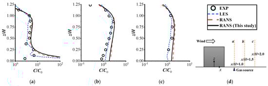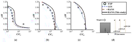 Vertical profiles of the dimensionless concentration C/C0 for the heavy gas case at center plane y/H = 0 behind the building: (a) x/H = 1.0; (b) x/H = 1.5; (c) x/H = 2.0; (d) positions of the vertical lines [27,28].