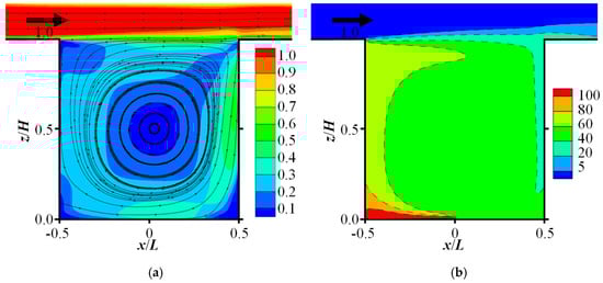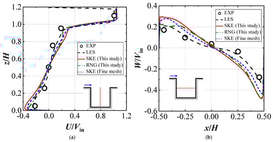 Comparison of normalized mean velocity profiles: (a) streamwise velocity U/Vin along the vertical centerline (x/H = 0); (b) vertical velocity W/Vin along the horizontal centerline (z/H = 0.5) [34].
