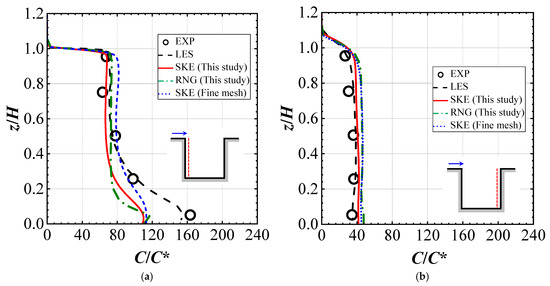 Comparison of normalized mean concentration C/C*: (a) along leeward side (x/H = −0.45); (b) along windward side (x/H = 0.45) [34].