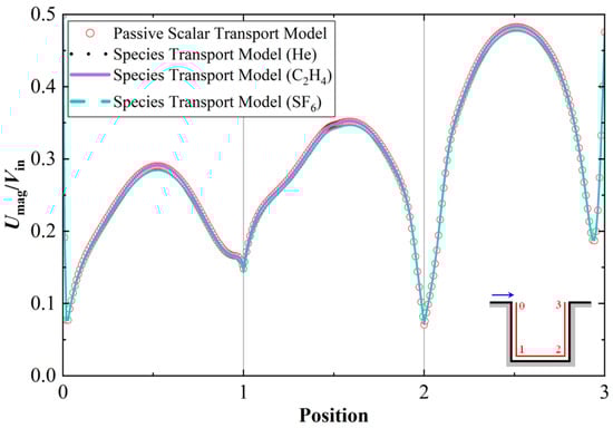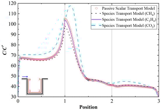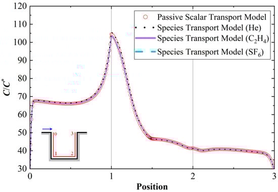 Figure 8 presents the dimensionless velocity magnitude Umag/Vin along the periphery of the street canyon (at a distance of 0.05H from the wall). For the passive scalar transport model, the density in all governing Equations (1)–(5) was treated as constant, whereas for the species transport model, it was treated as a variable. As displayed in Figure 8, the velocity magnitude distributions obtained from all CFD simulations nearly coincide. This indicates that for the low emission rates considered, the dispersion of buoyant pollutant—even with extreme variations in density—does not significantly alter the background flow field. Figure 9 compares the dimensionless mean concentration C/C* distributions along the same periphery line. The peak concentration is consistently observed near the lower leeward corner for all cases. Notably, the concentration profiles for light, neutrally buoyant, and heavy gases predicted by the species transport model are almost identical to each other and match the results from the passive scalar transport model. These findings demonstrate that, under low emission rates, the dispersion patterns and resulting concentration distributions are not sensitive to the gas type.