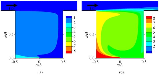 Kikumoto and Ooka [34] conducted wind tunnel experiments and LES on wind flow and neutral gas (C2H4) dispersion inside a 2D street canyon. The dimensions and geometry of the adopted street canyon model in this work were the same as those used by the above studies. Consequently, their experimental and LES results served as appropriate benchmarks for validating the present simulations. Figure 4a illustrates the 2D street canyon (or cavity) model, which has a width and height of H = 1 m, yielding an aspect ratio of 1. The canyon extends 0.3H in the spanwise direction. The computational domain above the street canyon has a vertical height of 0.2H, with upstream and downstream extensions of 0.6H each to allow for flow development. The inflow wind velocity was set to Vin = 1 m/s. The pollutants with varying plume buoyancies were released from a ground-level line source positioned at the canyon center. The source had a width of 20 mm, with the coordinate origin defined at its midpoint. All calculated concentrations were normalized by the reference concentration C* = Q/(Vin·H2), where Q is the volumetric discharge rate (m3/s).