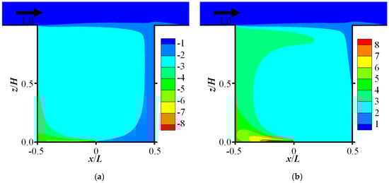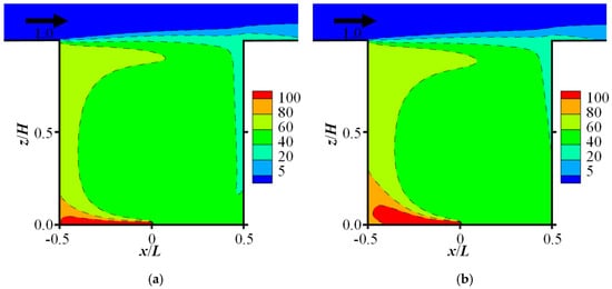 Figure 12 presents the dimensionless concentration distributions for Cases 4 and 6. The red and orange colors denote high-concentration zones (C/C* > 80). The extensive red and orange regions in the lower-left corner indicate that high-concentration pollutants accumulated in this area. Although the overall gas dispersion patterns are both similar to that displayed in Figure 7b, a significant difference is evident in Figure 12a,b. Compared with Case 4, much higher concentration was found near the lower-left corner in Case 6. This difference arises because the recirculation within the street canyon is enhanced when a large amount of light gas is released (Case 4), whereas it is suppressed when a large amount of heavy gases is released (Case 6). The enhanced recirculation draws more fresh air into the inner canyon, thereby diluting the polluted air.