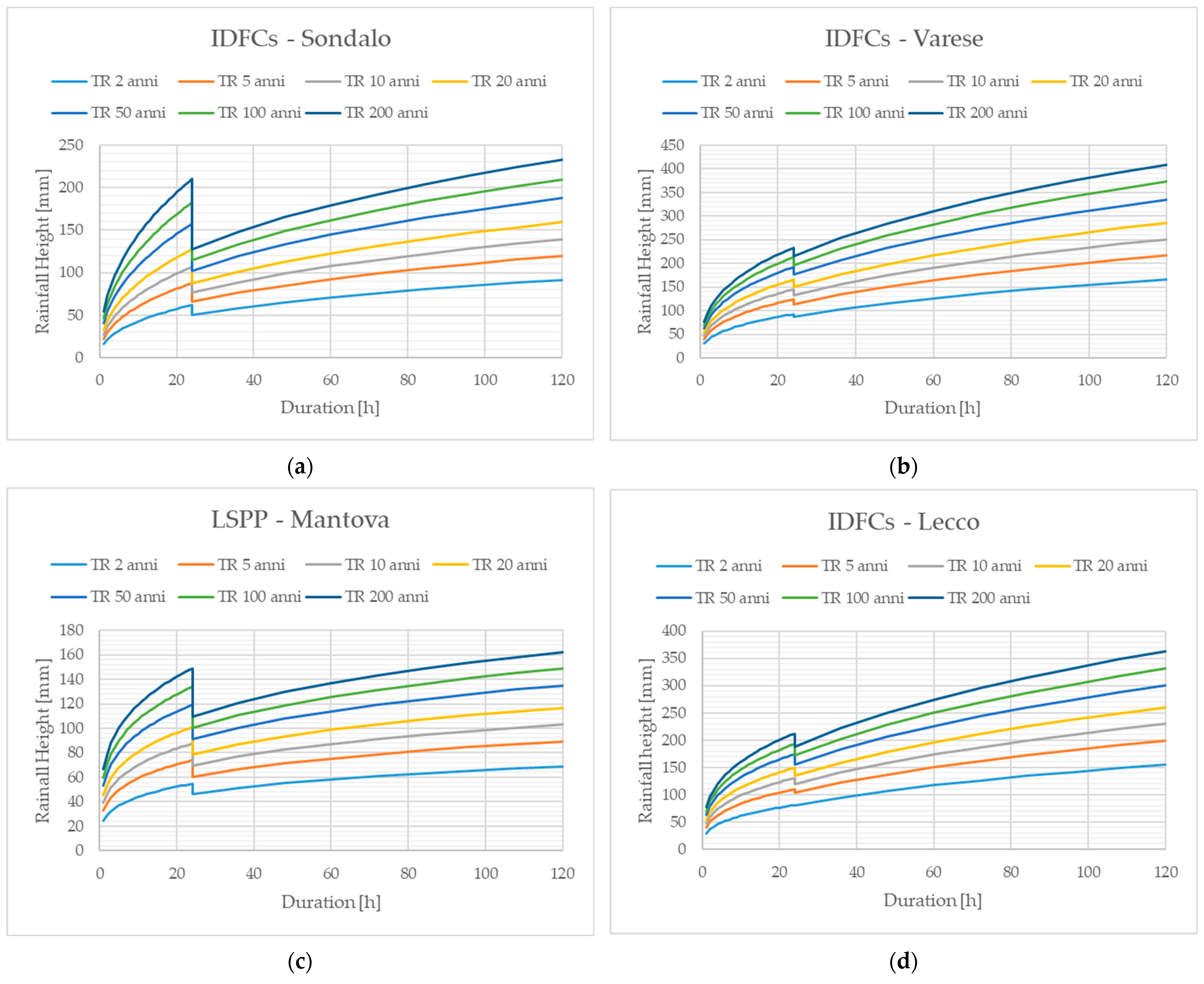 Thirdly, the reference IDF curves in the Lombardy region have been evaluated using the GEV methodology, but other strategies have been implemented in other parts of the Italian territory (such as TCEV, the Two-Component Extreme Value distribution [