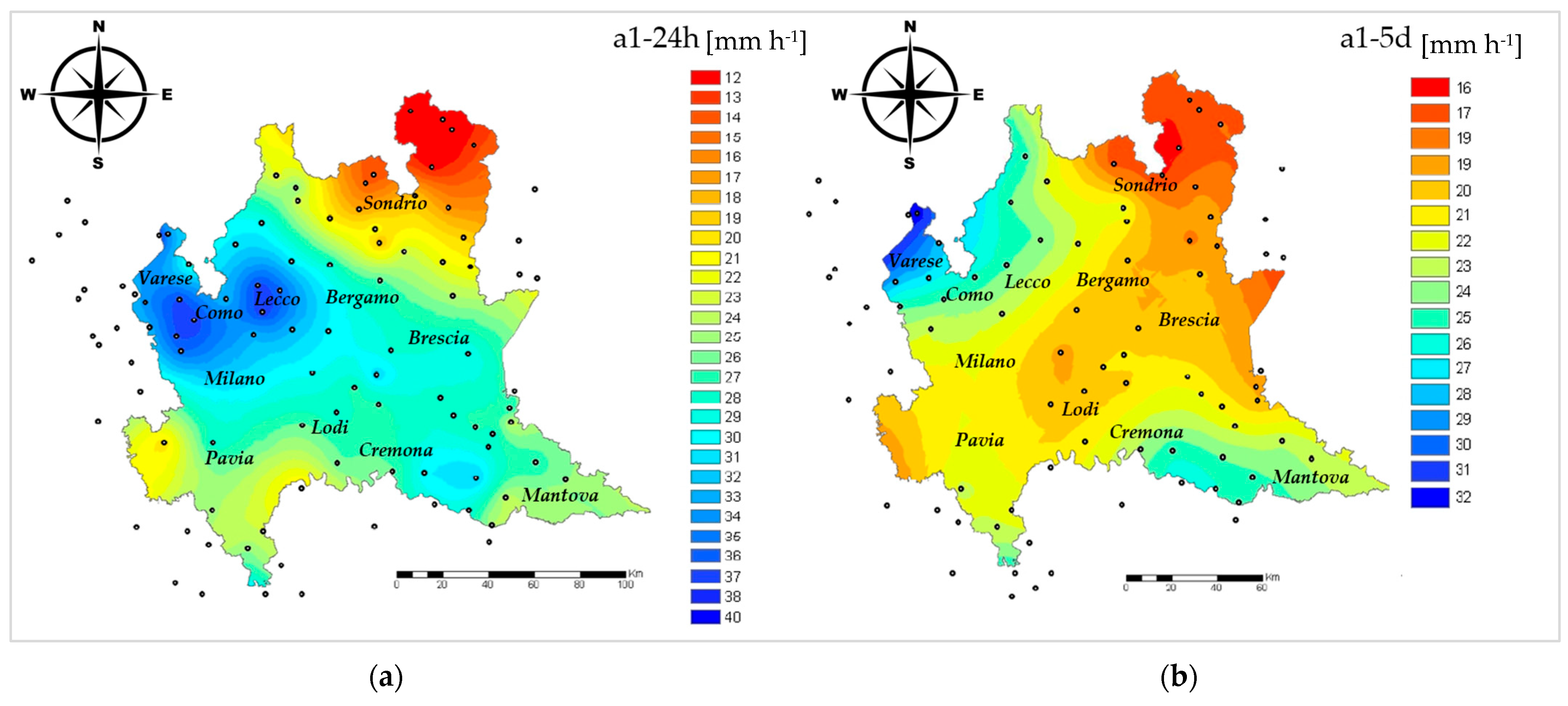 87]. This “methodological” difference can be appreciated by comparing the differences between the IDF curves’ statistics at 24 h and 1 day. As was presented in the results, this difference is negligible at the wettest location of the Lombardy region (i.e., the western part), while it is in the order of 40–50% in the dryest locations (i.e., the eastern part). This discrepancy should be taken into account when IFD curves are applied for hydraulic projects, because it does not have a physical meaning and is just related to the sampling method of the rain gauge data. Our analysis has pointed out a possible correlation with the 2D spatial distribution of the