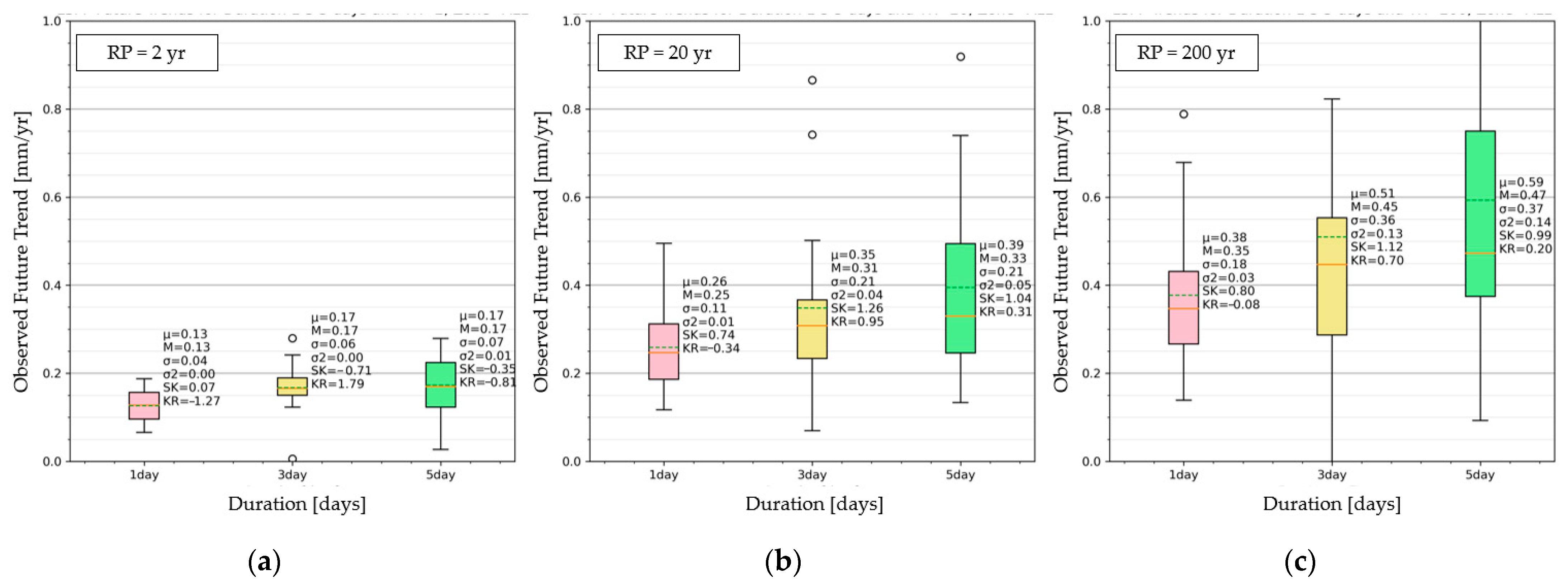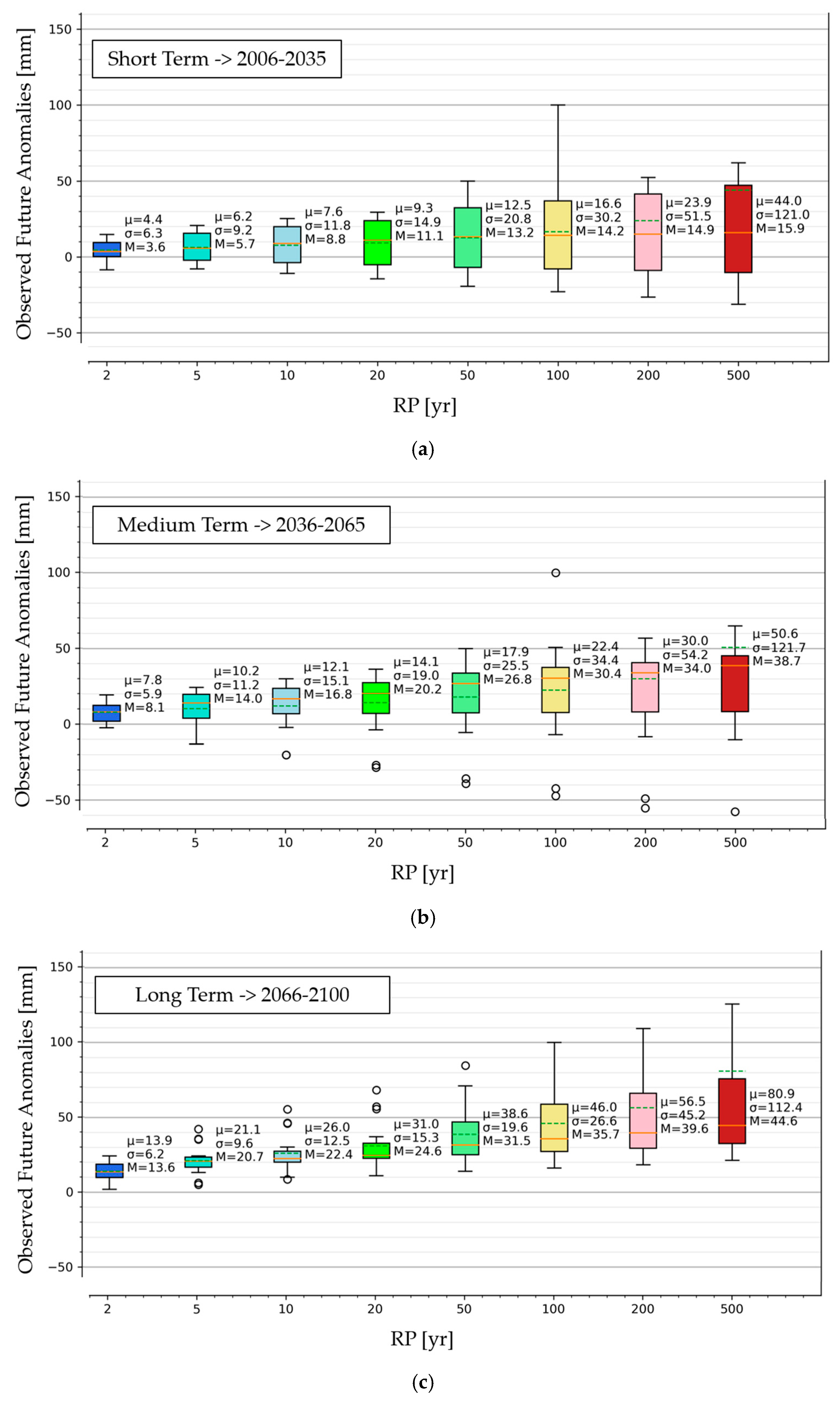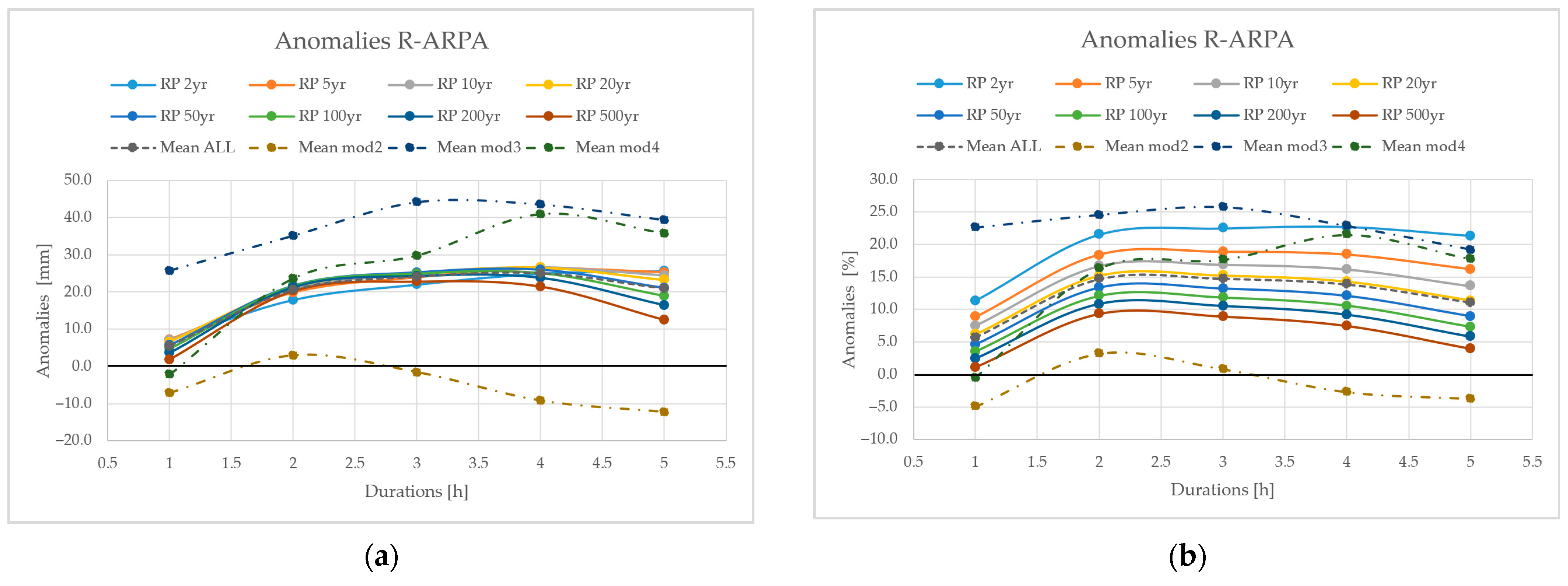 The climate anomaly will increase progressively moving forward in the future by about +20–30 mm if all durations and RPs are averaged. This data can be interpreted as a long-term linear trend of +0.2–0.3 mm yr