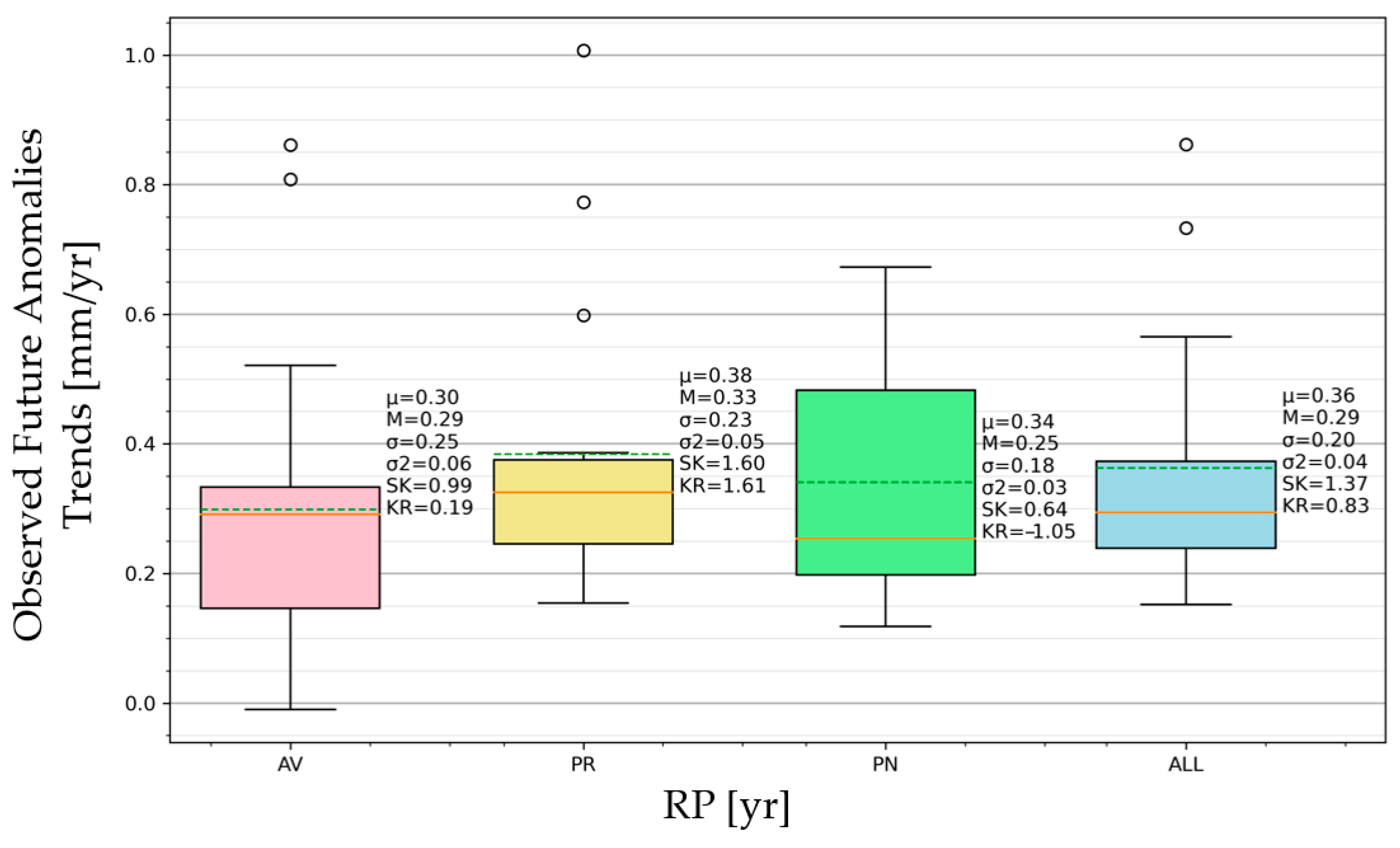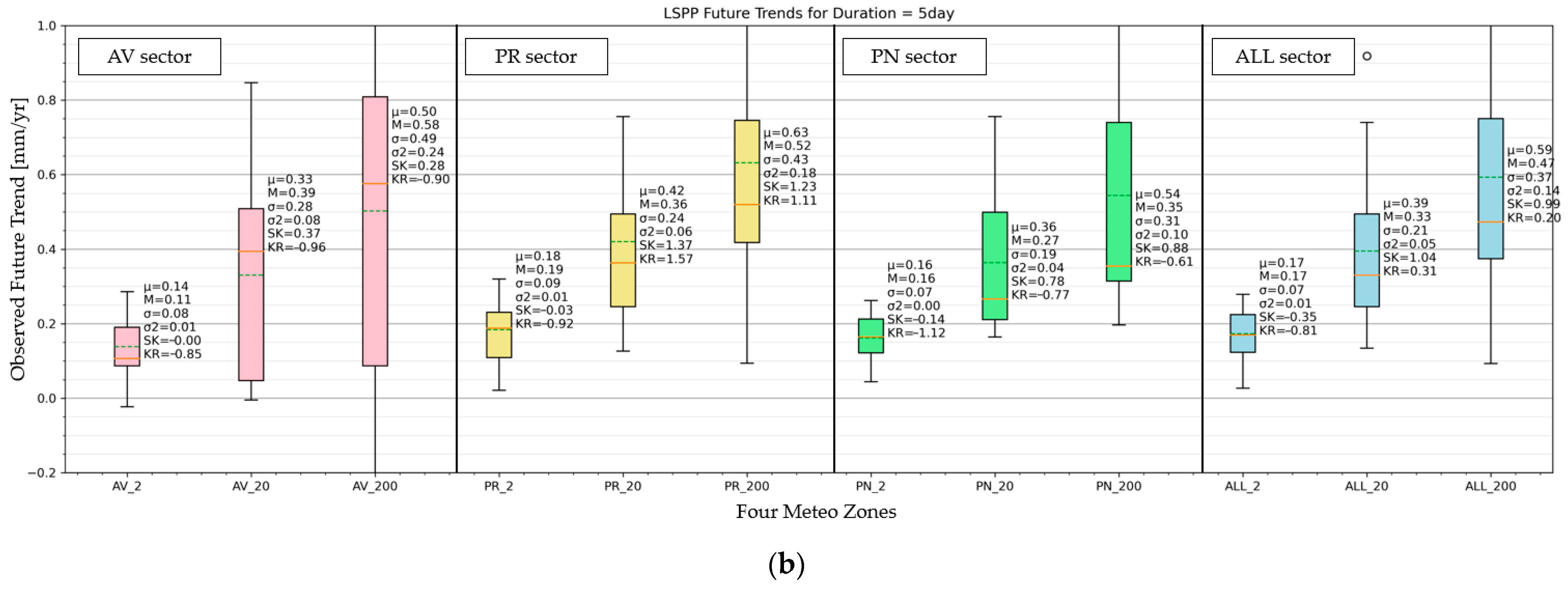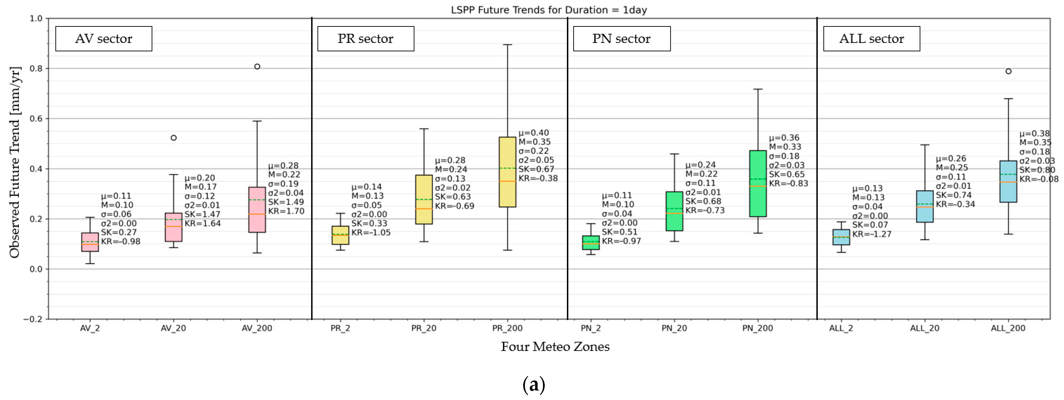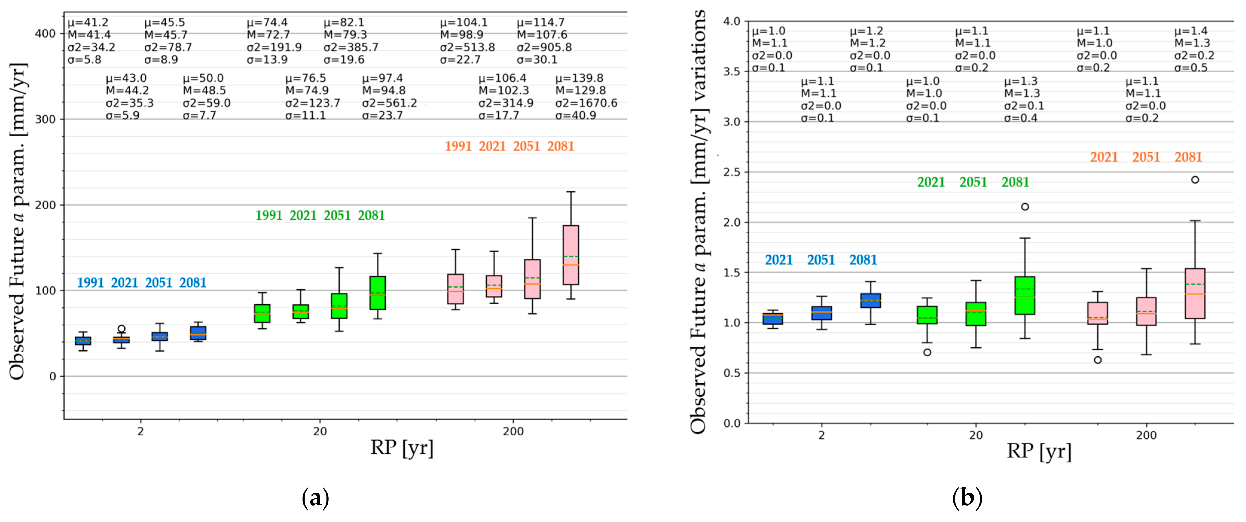 The climate anomaly will increase progressively moving forward in the future by about +20–30 mm if all durations and RPs are averaged. This data can be interpreted as a long-term linear trend of +0.2–0.3 mm yr