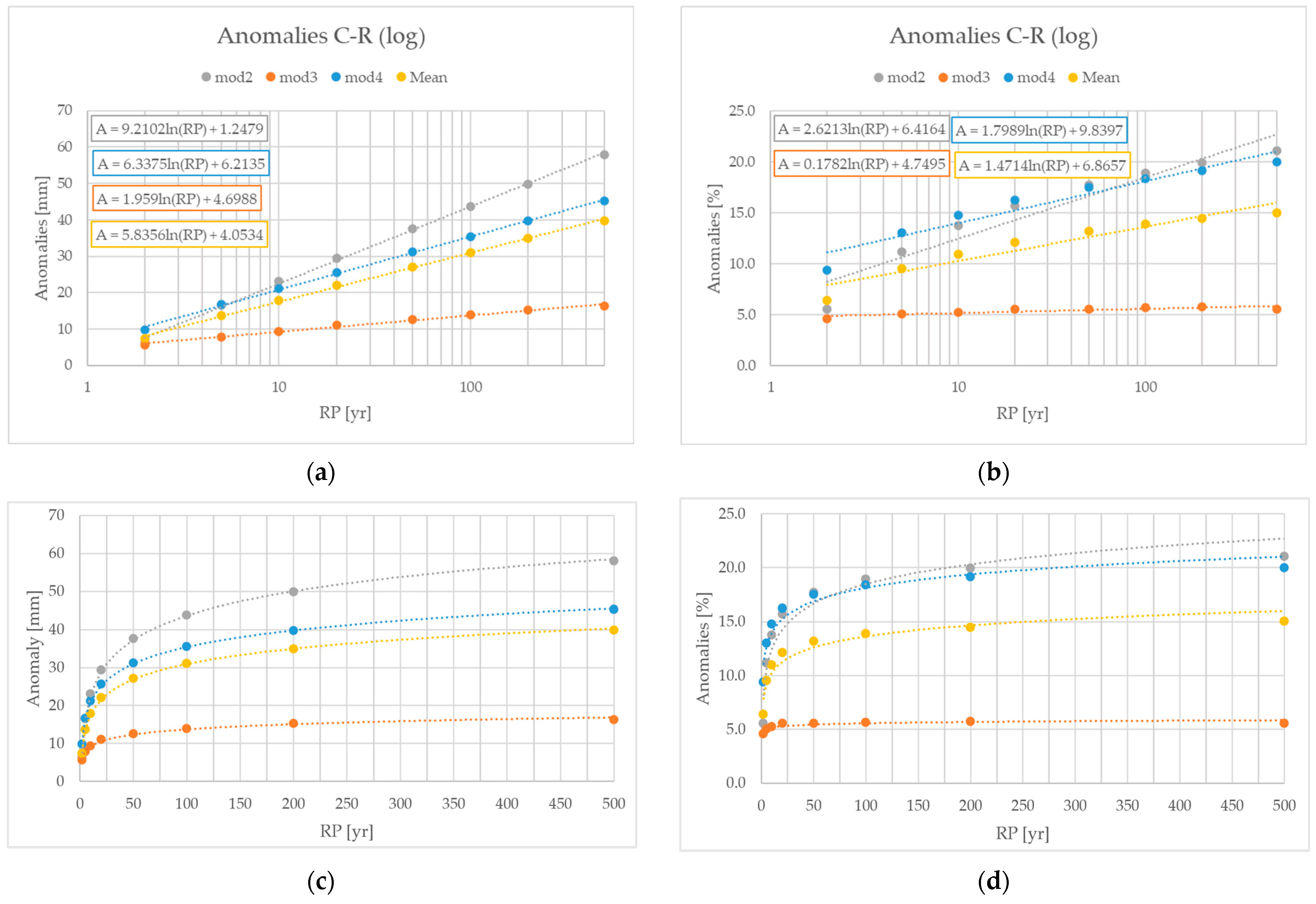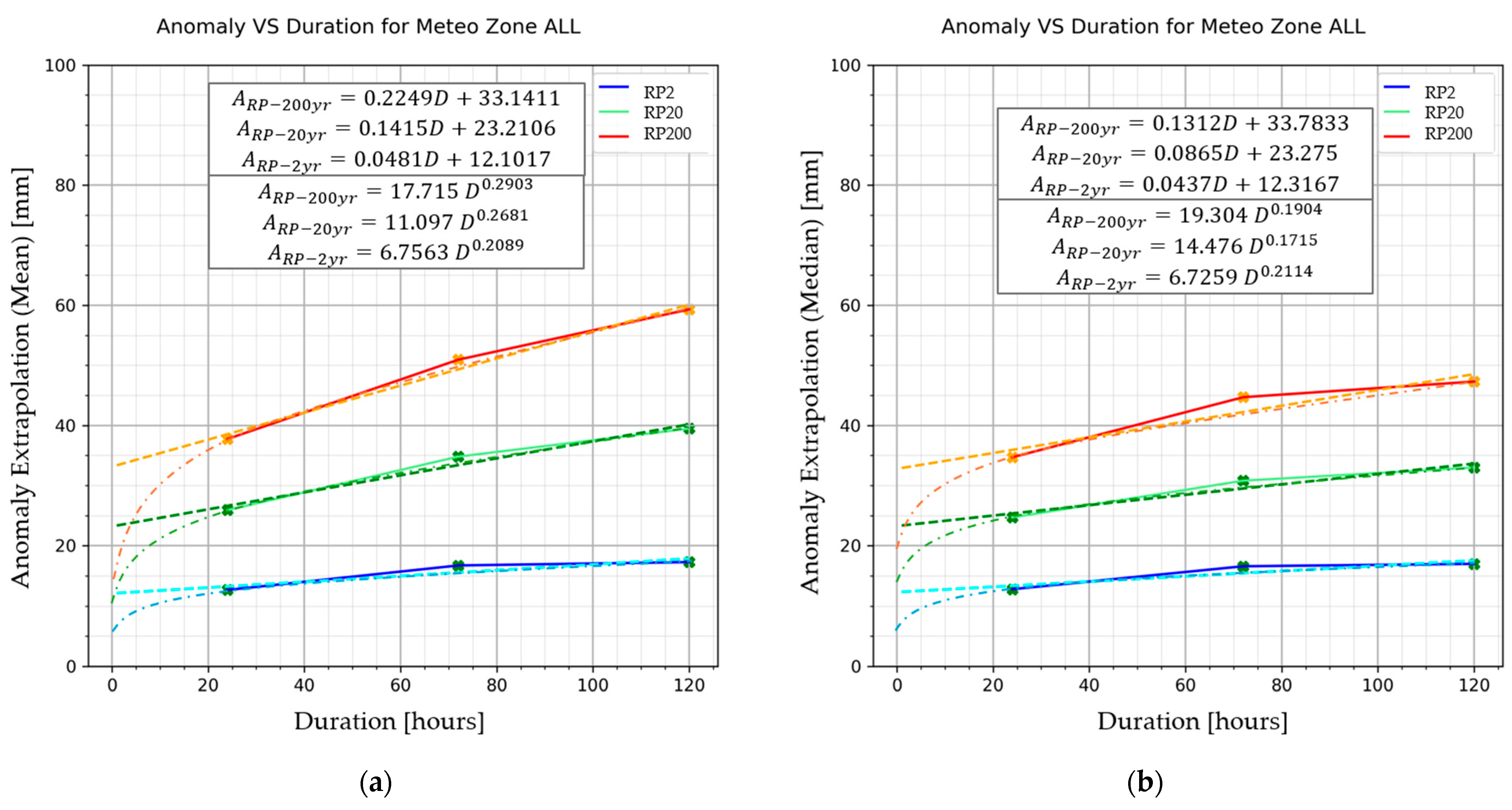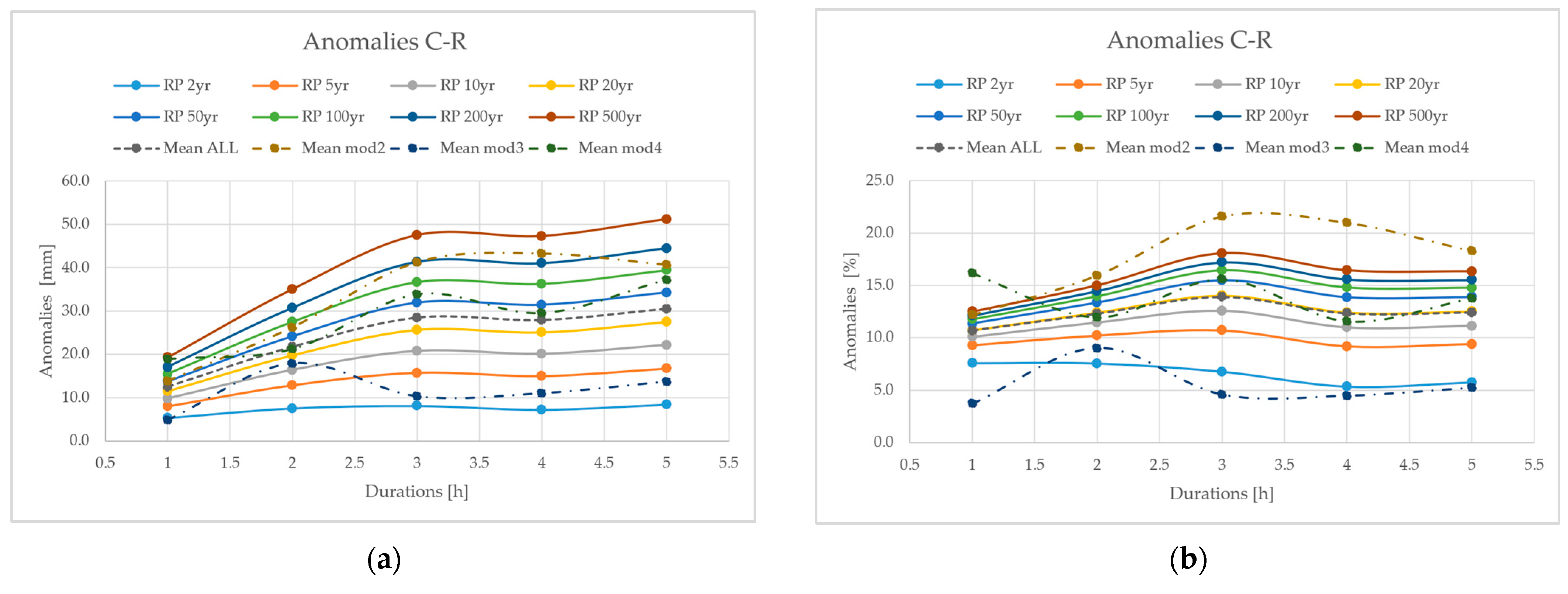 82]. However, having calculated the daily anomaly (1 to 5 days), a duration–anomaly function for a specified RP was retrieved. The data were interpolated using linear and power-law trend curves and then extrapolated to sub-daily data, giving a simplified estimation of the possible anomalies. Among the two curves, the linear approximation appears more ‘crude’ with respect to the power-law, admitting more anomalies (double) for short-duration events. This technique has been proposed in order to cope with the climate data limitations, and, in our opinion, it represents a straightforward way to at least take into account the climate change influence for sub-daily IDF curves. In this regard, sub-daily data future projections are crucial, since they are frequently applied in the design of sewage networks, which are characterised by a correlation time in the order of a few hours [
