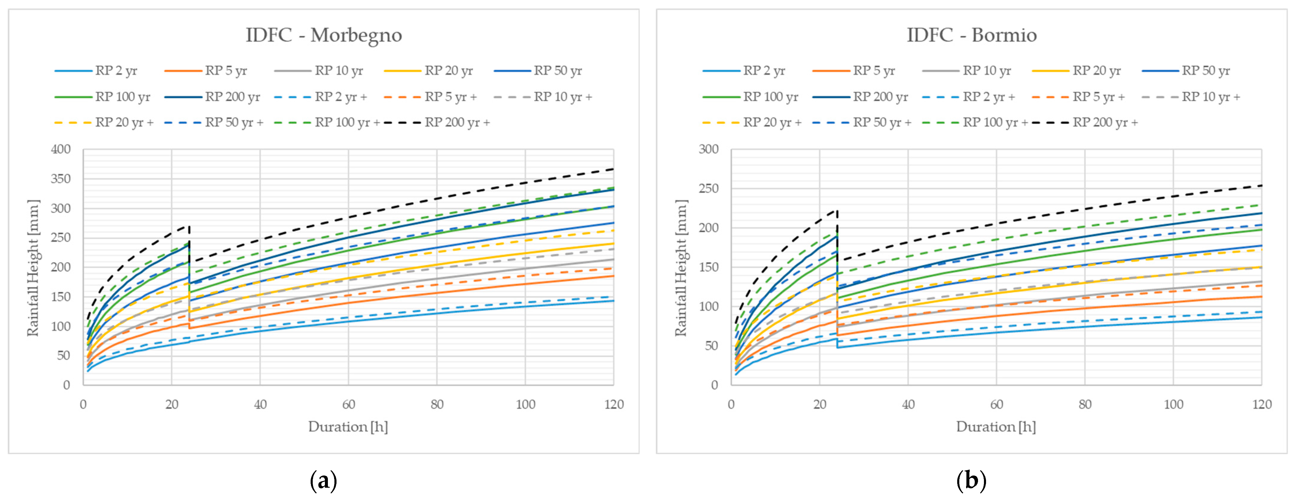 Figure 4). According to hydraulic engineers working in this sector, a possible suggestion for solving this issue is to consider, among the durations of 1 day or 24 h, the worst-case scenario (i.e., the highest intensity, for a selected RP).